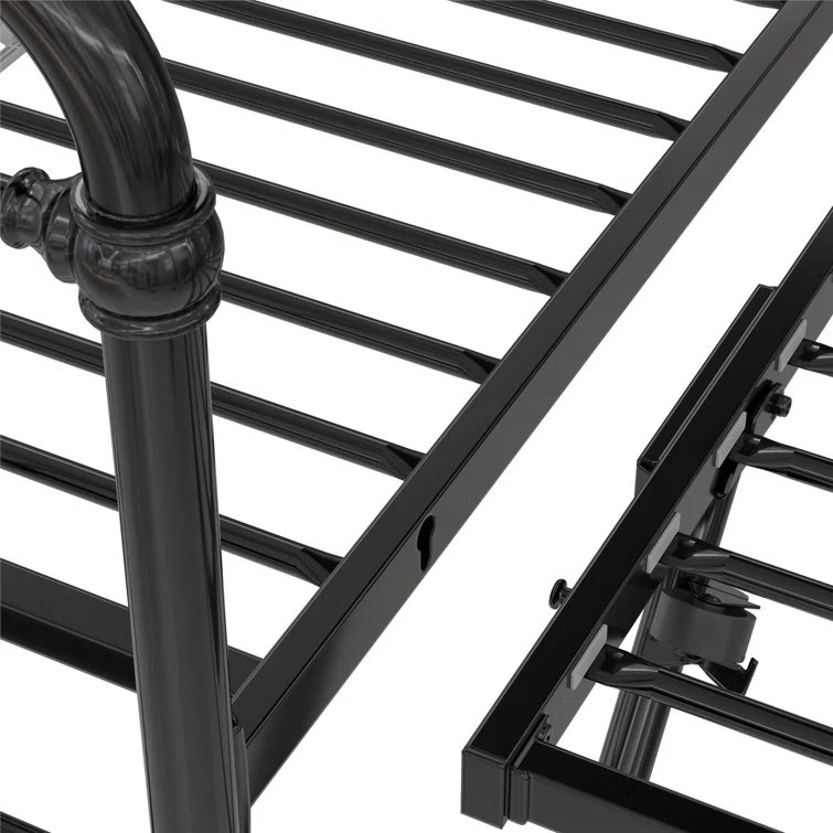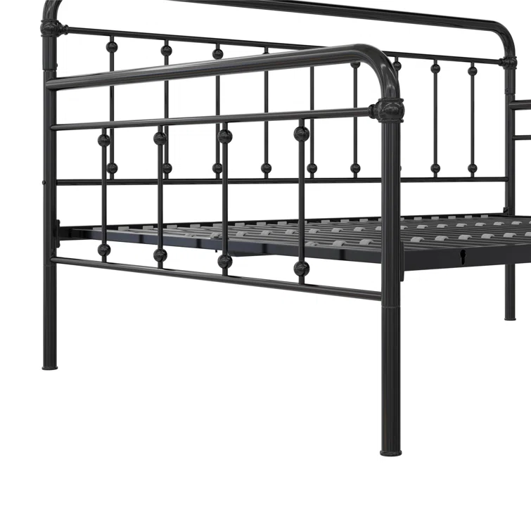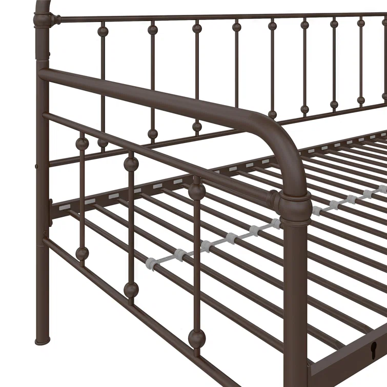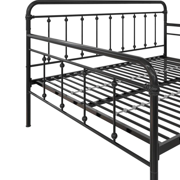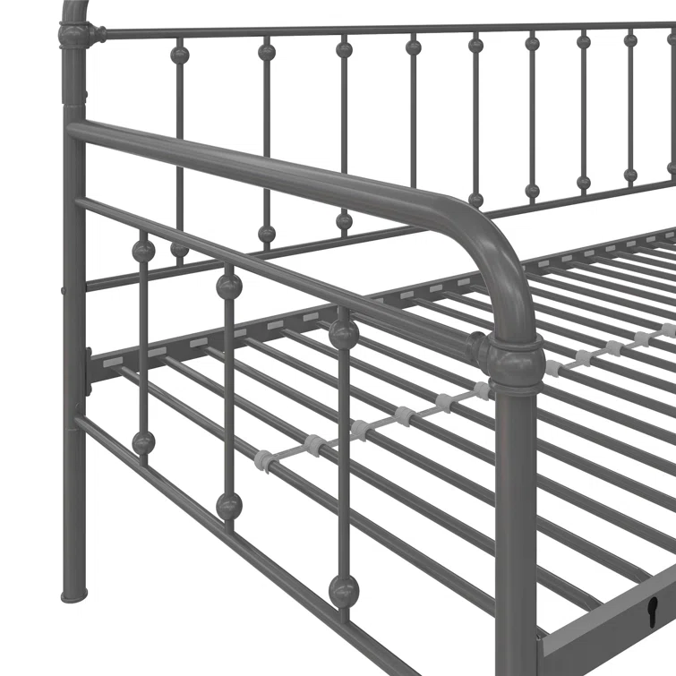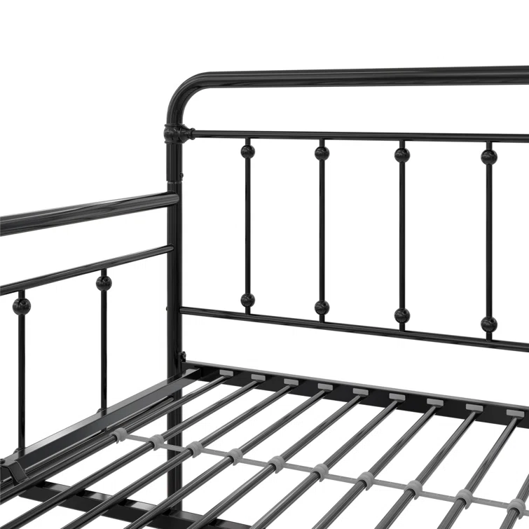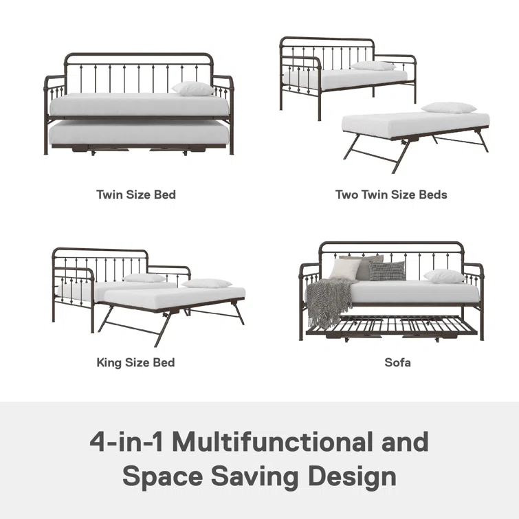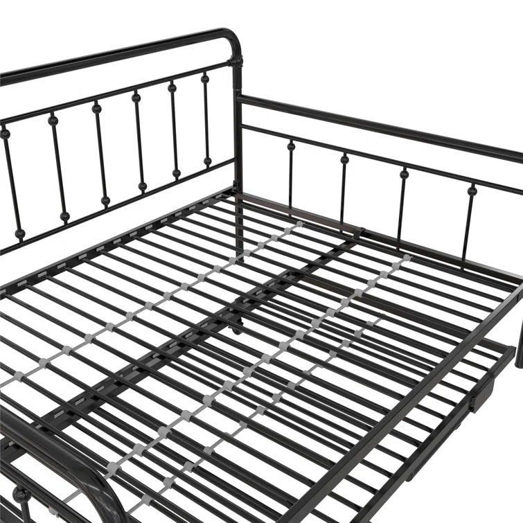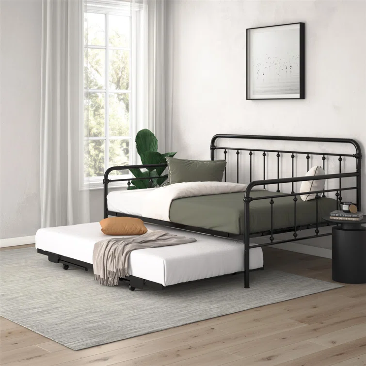 This versatile daybed with a pull-out trundle adapts to your needs, whether it's for hosting guests or providing a cozy spot for lounging. The trundle bed lifts to full height using foldable legs, creating an even sleeping surface when combined with the daybed. This frame is crafted from powder-coated steel with a sleek finish, and it showcases spindles and curved edges for a sleek look. The trundle is equipped with lockable caster wheels for easy movement and can be stored neatly under the daybed when not in use. To keep your floors scratch-free, the daybed features plastic-capped legs. Just wipe clean with a damp cloth for easy maintenance.