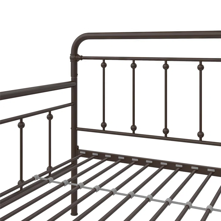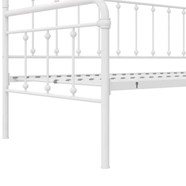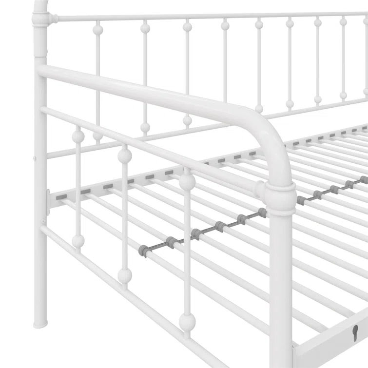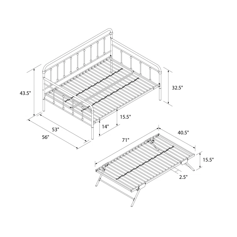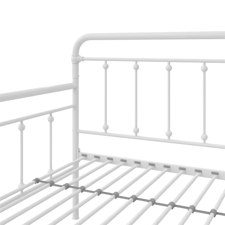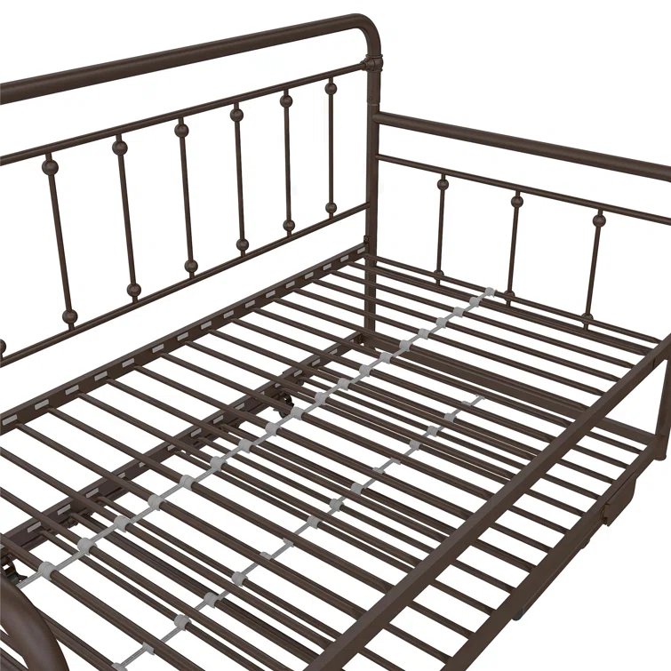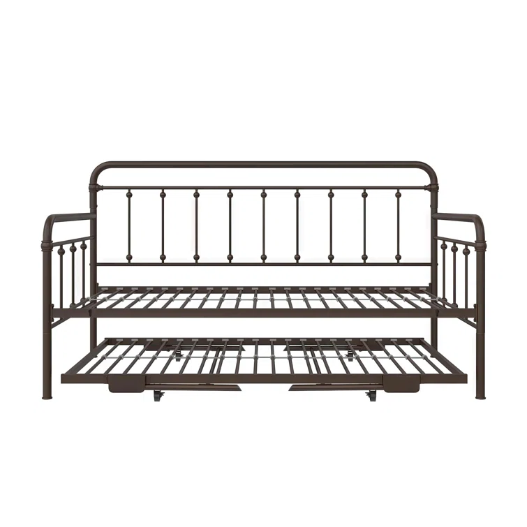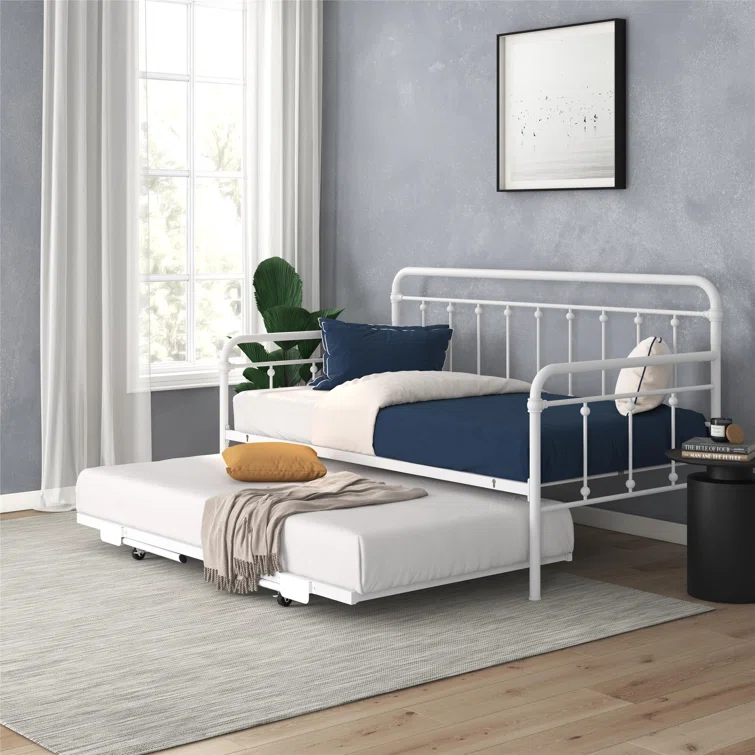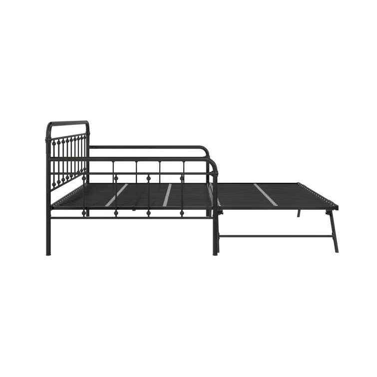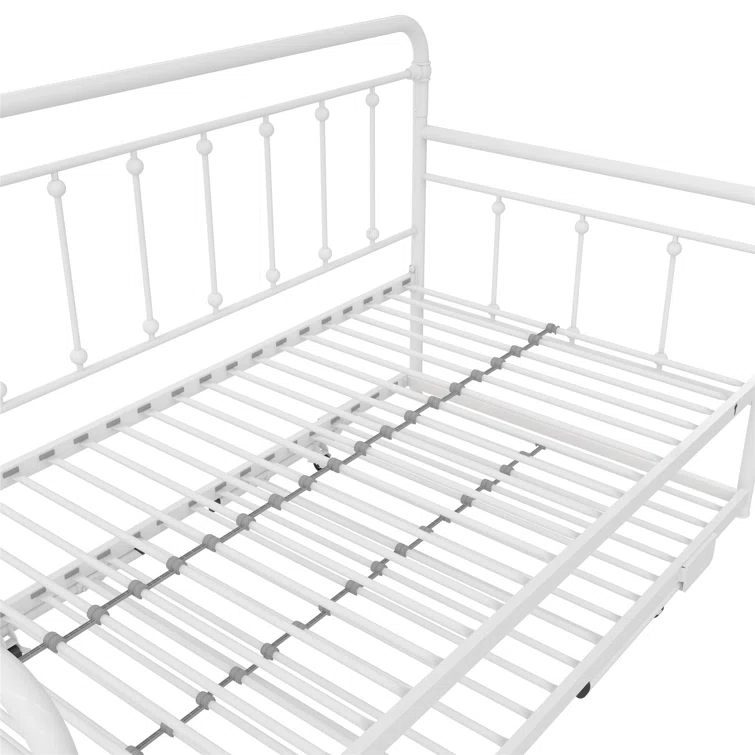 - Our metal daybed includes a pull-out trundle bed with folding legs that bring the unit to an even height for an off-the-floor sleepover experience and a fastener that attaches the daybed to the trundle to form a larger bed and avoids trundle movement.