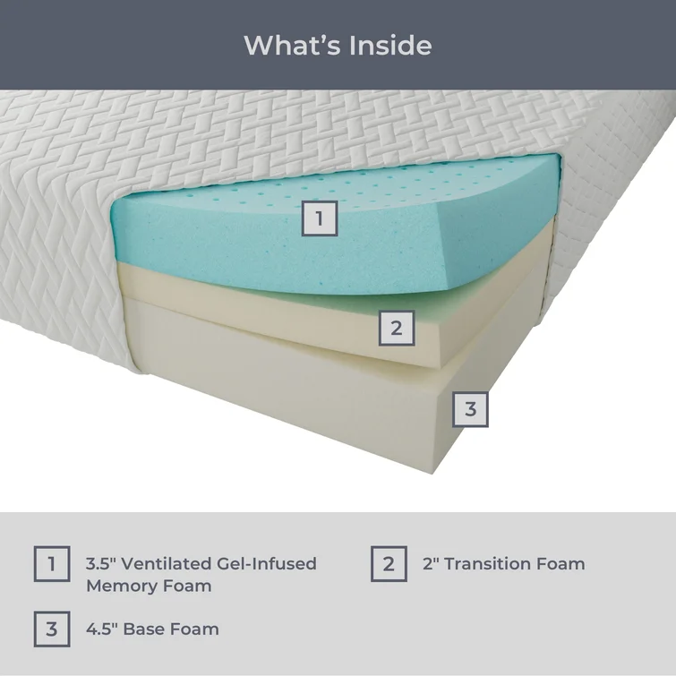 If you love to flop down and sink into the comfort of your bed at the end of the day, then you love this mattress. This 10" Plush gel memory foam mattress has a solid foam base topped with transition foam and gel-infused memory foam to provide just the right amount of comfort and support. Contouring memory foam conforms to your body while you sleep to help align the spine, relieve pressure point aches, and create a Plush sleep surface. Plus, thanks to the cooling gel infusions and breathable ventilation holes, you can rest easy and keep cool.