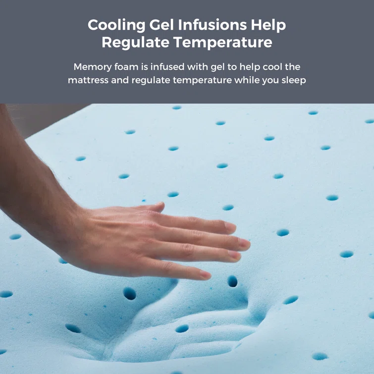 - Cooling gel infusion: memory foam is infused with gel to help cool the mattress and regulate temperature while you sleep