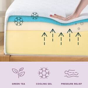 • Pressure-relieving: Foams - Layers of ultra-cooling gel and green tea-infused memory foam, soft comfort foam, and durable, high-density base foam.