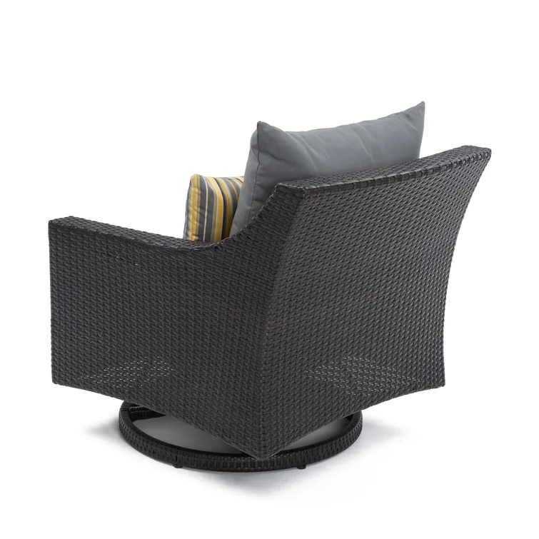 Designer cushion covers are added to our water-resistant black cushions for maximum protection. Easily unzip them for washing or replacement if desired.