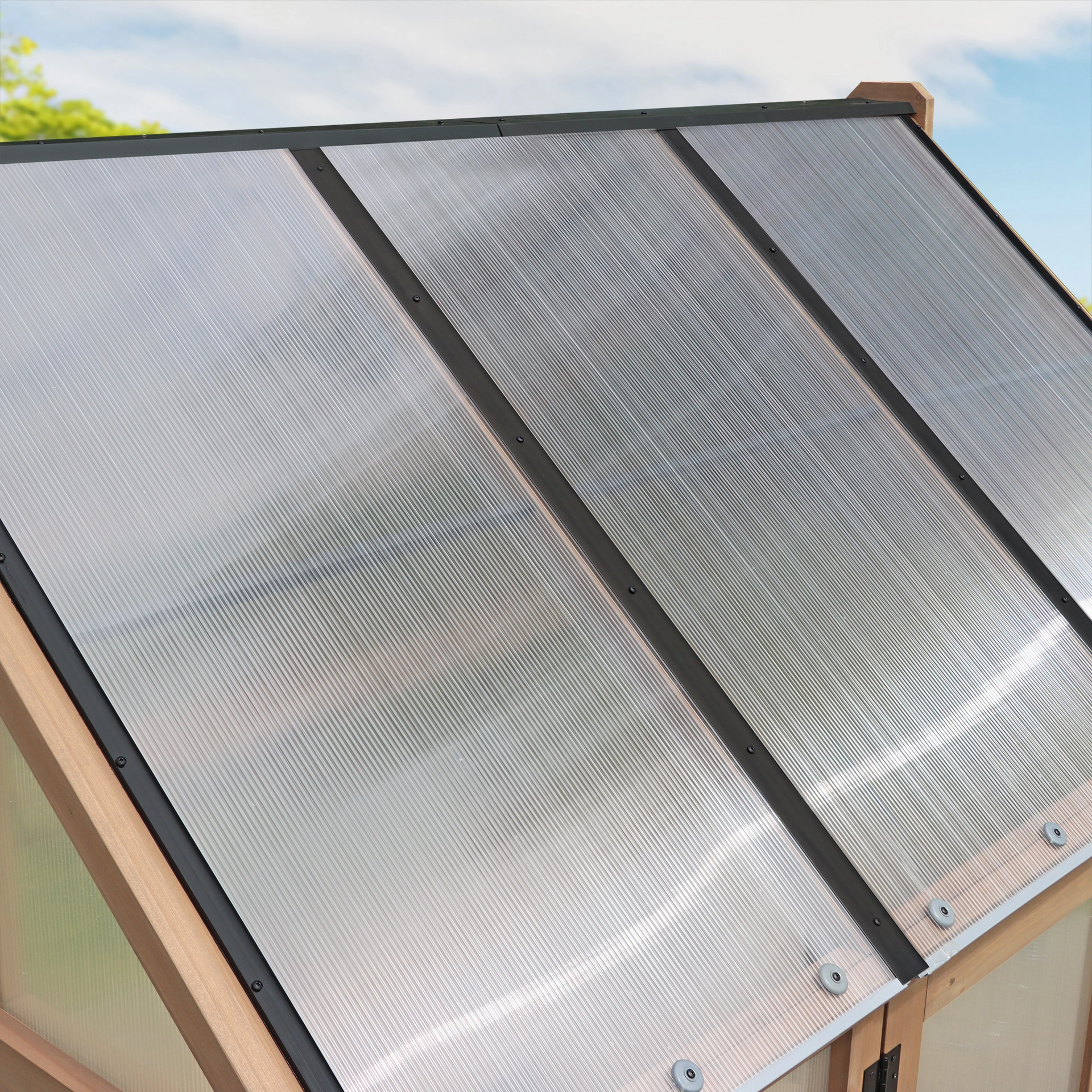 Elevate your garden with the 6.7 ft x 7.6 ft Greenhouse by Yardistry, expertly crafted to nurture your plants and refine your gardening skills with a perfect balance of style and functionality! Bask in an abundance of natural light that transforms your greenhouse into a bright, welcoming sanctuary where your plants thrive. The premium casement window guarantees optimal airflow, while the stylish metal peak truss hangers provide a sleek, sturdy solution for showcasing hanging plants. Tailor your entryway with a versatile door that can be installed at the front or side to match your preferences. Plus, an automatic, heat-activated gable vent ensures climate control, creating the perfect environment for your plants to flourish.