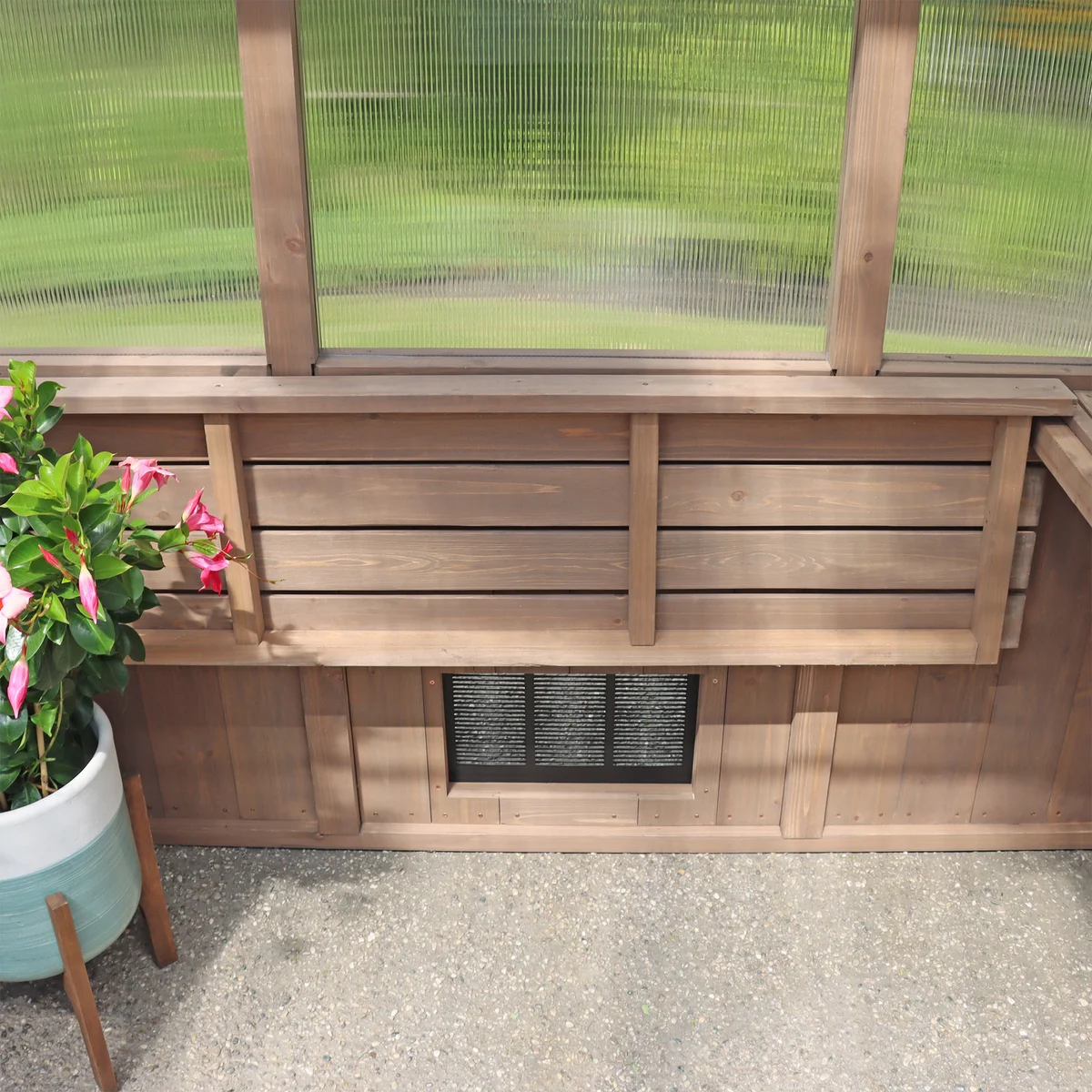 Tongue and groove style 33” high premium outdoor wood base walls add a premium aesthetic and allows for storage of gardening tools that are out of sight from the exterior.
