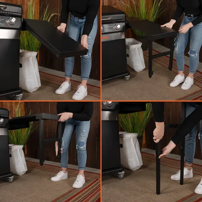 Does your grill have a folding side table attachment like this Blackstone culinary 36 inch griddle? When you want the ultimate outdoor cooking setup, a four-burner, cabinet-style griddle with a fold-out side table is a must. From a sleek panel to double the shelf space in seconds, you'll be able to set all your food, accessories, and seasonings in reach before you start. This flat-top grill has four independently controlled burners and a hood for hot, fast cooking. The bottom cabinet is the perfect place to store your propane tank and tools. And you won't have to worry about touching things with dirty hands, a built in paper towel rack and garbage bag holder help you keep things clean!