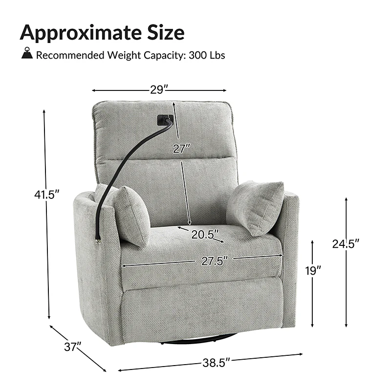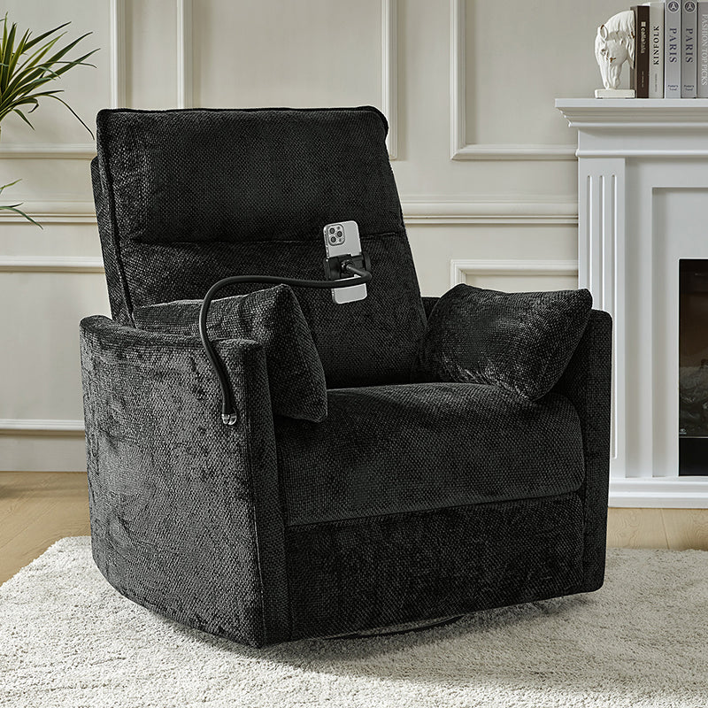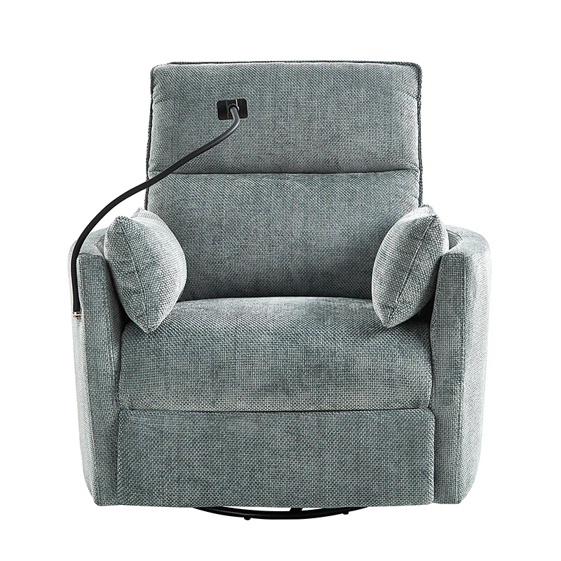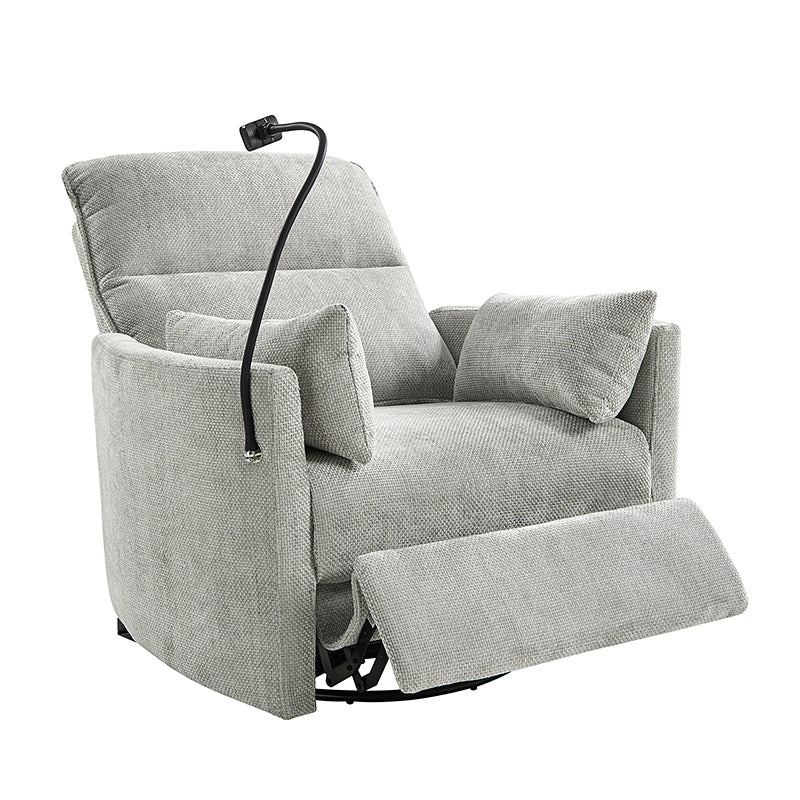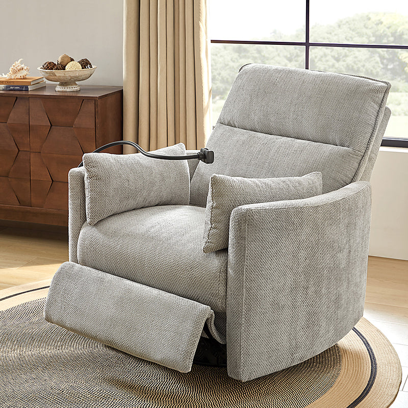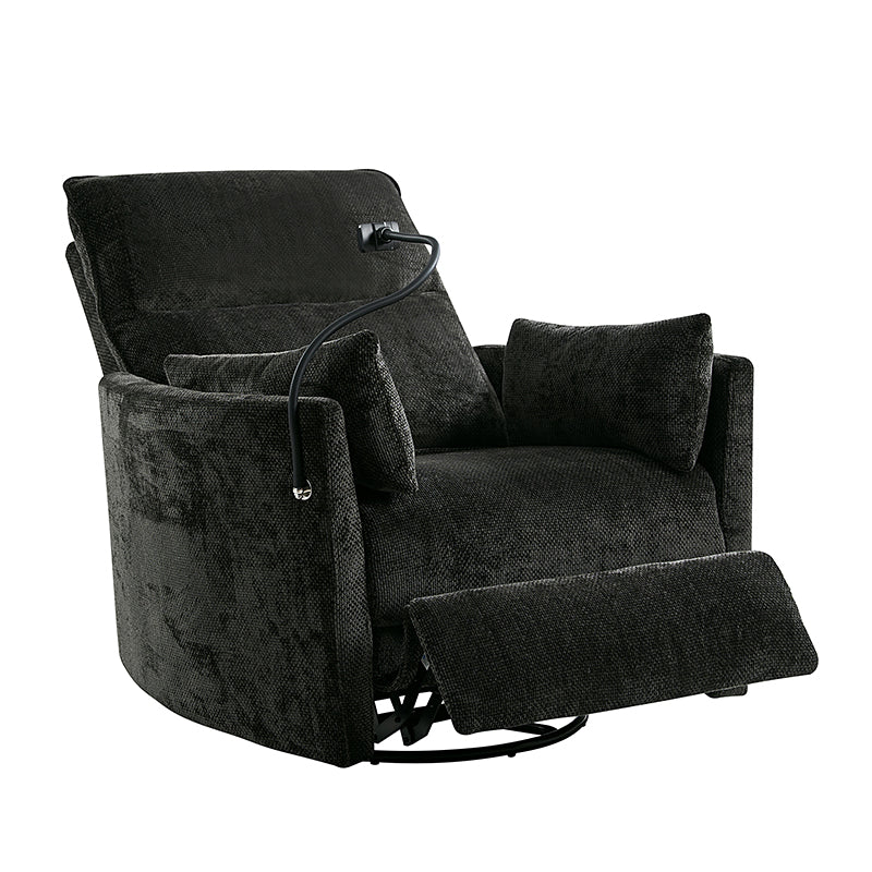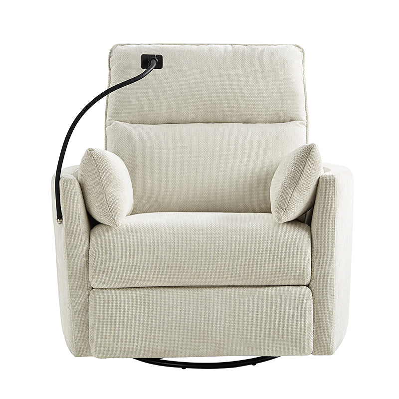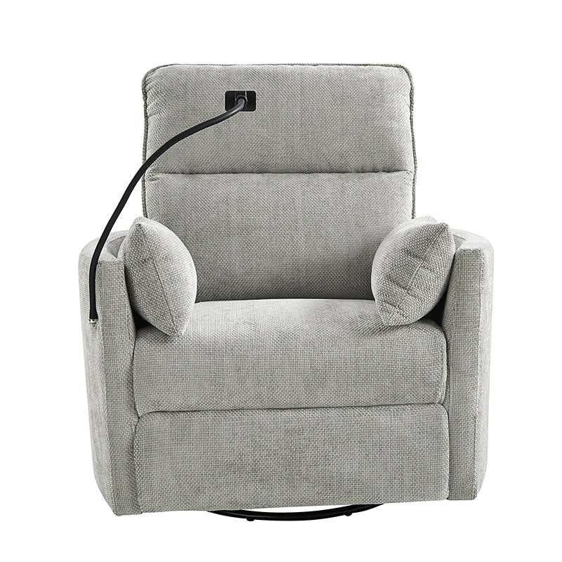 Experience ultimate comfort and convenience with the modern-style oversized recliner. This versatile design features electric reclining, rocking, and swiveling functions for effortless relaxation. Stay connected with built-in USB charging ports and a convenient cell phone holder, ensuring your devices are always within reach. The lumbar pillow provides essential support for your lower back. The armrest pillow adds an extra layer of coziness, ensuring unparalleled comfort during extended lounging sessions. Elevate your relaxation experience with this sleek and functional recliner, combining style, convenience, and ergonomic design in perfect harmony.