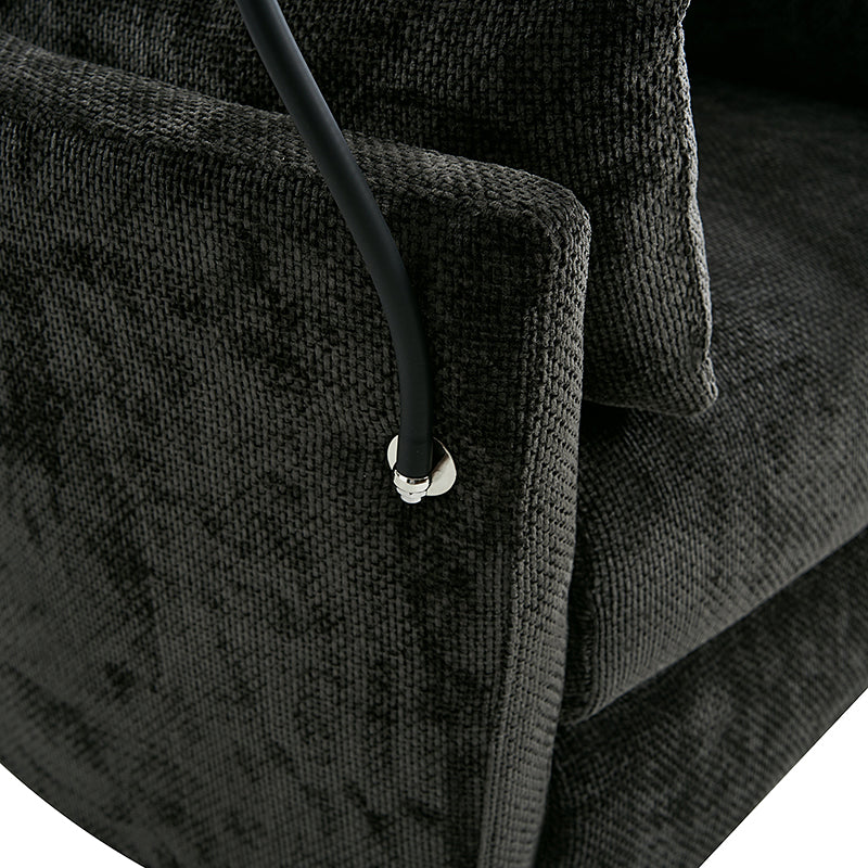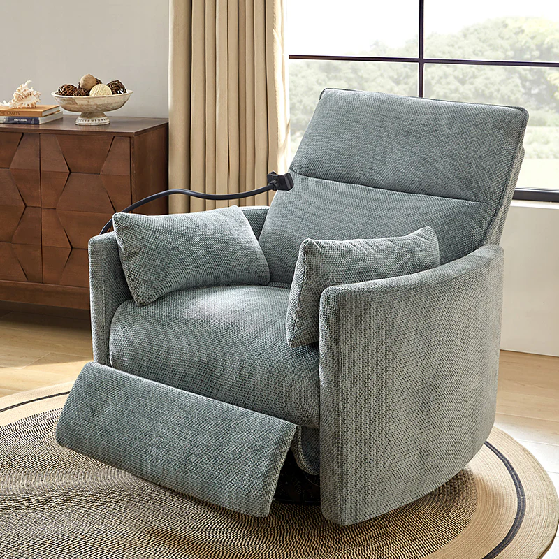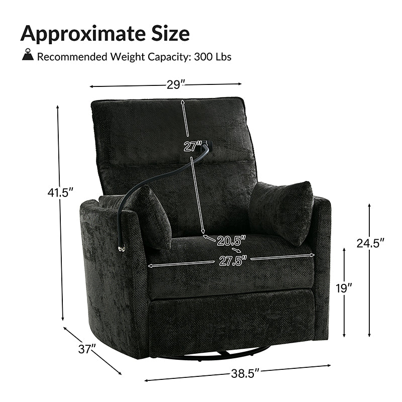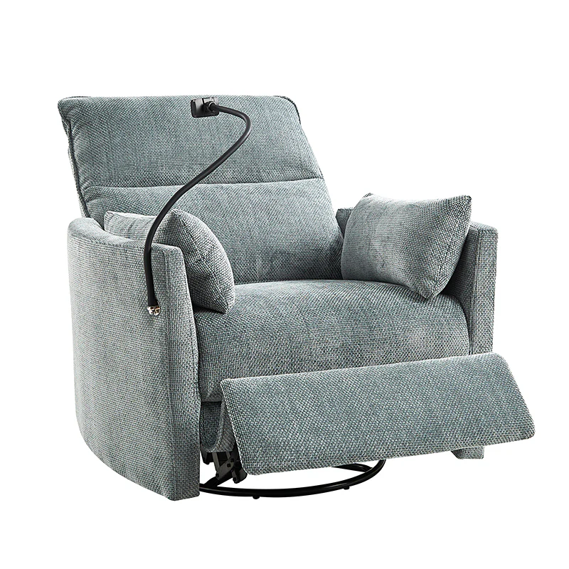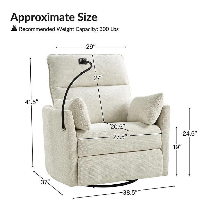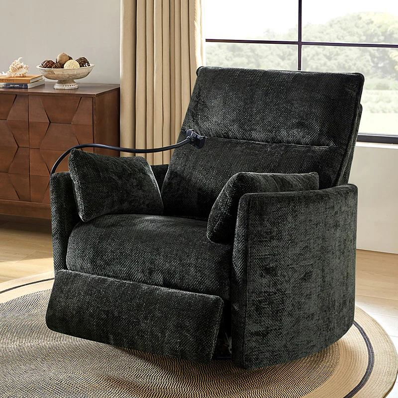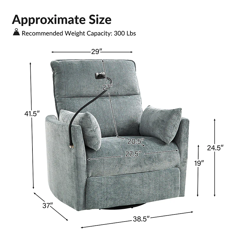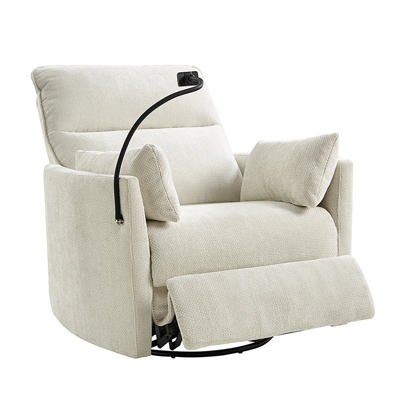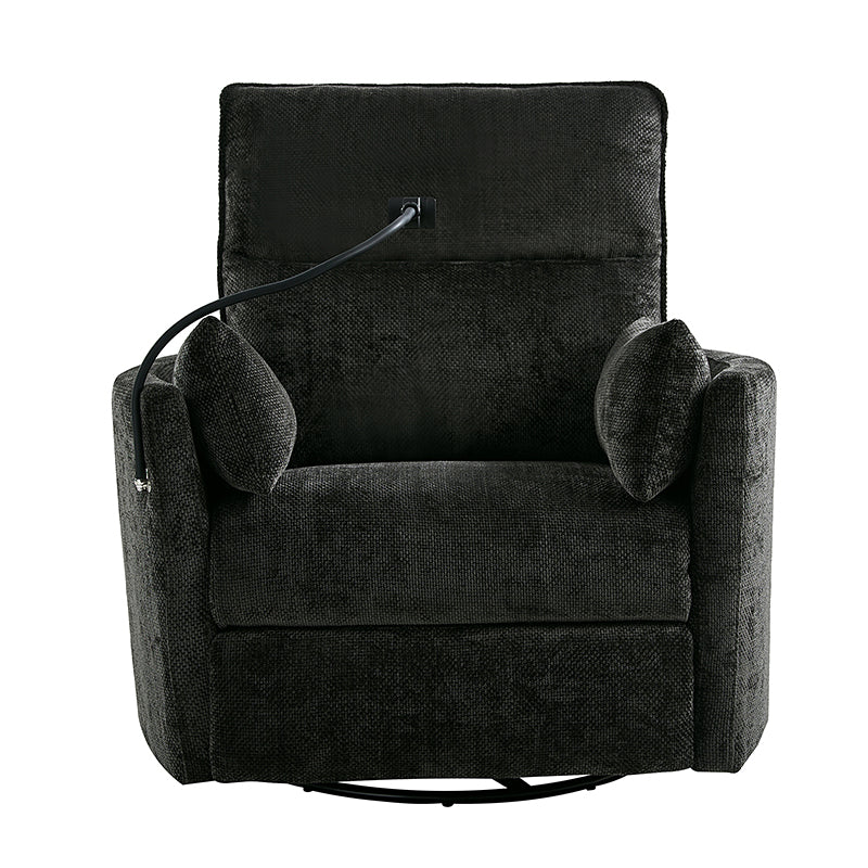 Experience ultimate comfort and convenience with the modern-style oversized recliner. This versatile design features electric reclining, rocking, and swiveling functions for effortless relaxation. Stay connected with built-in USB charging ports and a convenient cell phone holder, ensuring your devices are always within reach. The lumbar pillow provides essential support for your lower back. The armrest pillow adds an extra layer of coziness, ensuring unparalleled comfort during extended lounging sessions. Elevate your relaxation experience with this sleek and functional recliner, combining style, convenience, and ergonomic design in perfect harmony.
