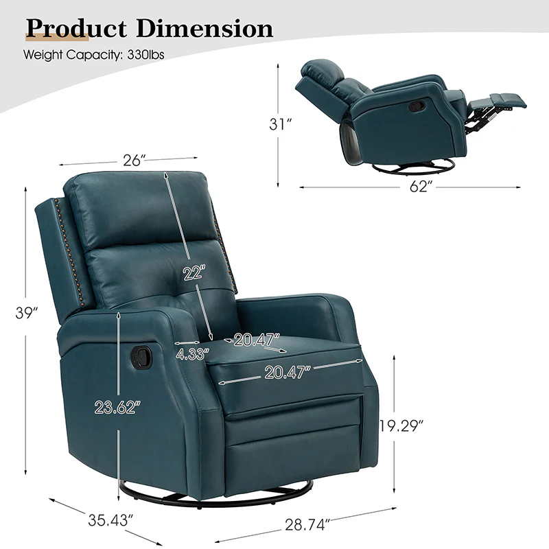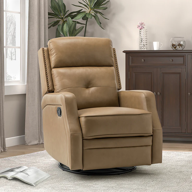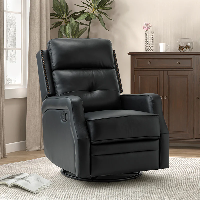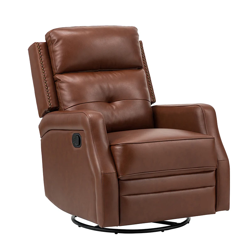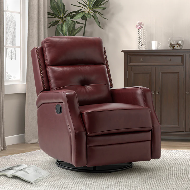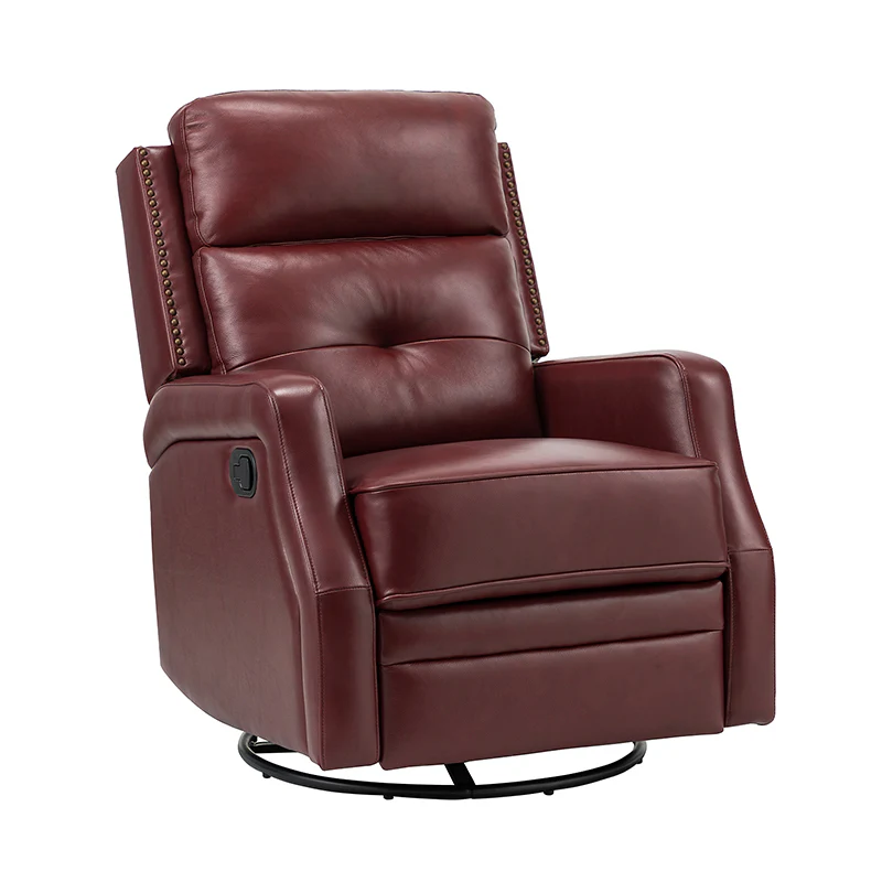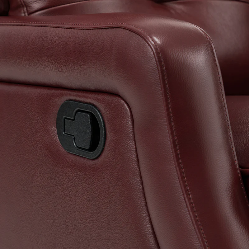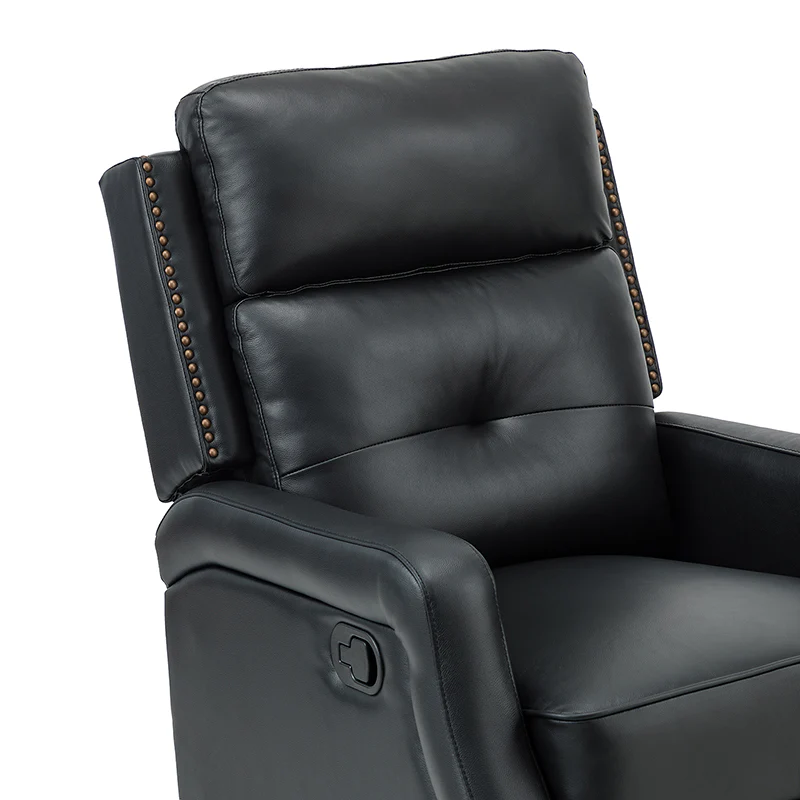 Sit back and relax during movie night in the living room or den with this genuine leather recliner. Available in 5 position states allowing you to recline and relax manually, this recliner exudes luxury and comfort whether sitting or reclining. Smooth genuine leather adds sophistication and lets you relax without breaking the bank. Crafted from sturdy wood and metal, this recliner has a modern look with mid-century elements, adding a simple yet stylish appeal to any living room. Gorgeous nailhead accents outline beautiful shapes and add rich and whimsical character to your space. Plus, it's the perfect recliner for grabbing some freshly buttered popcorn with the whole family on a Friday night, having fun, and watching a movie together.