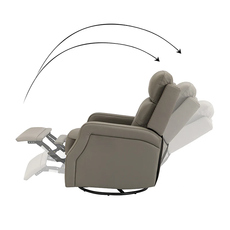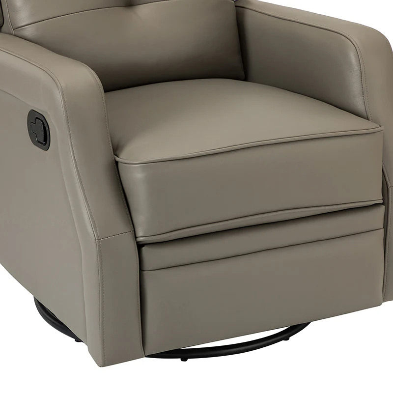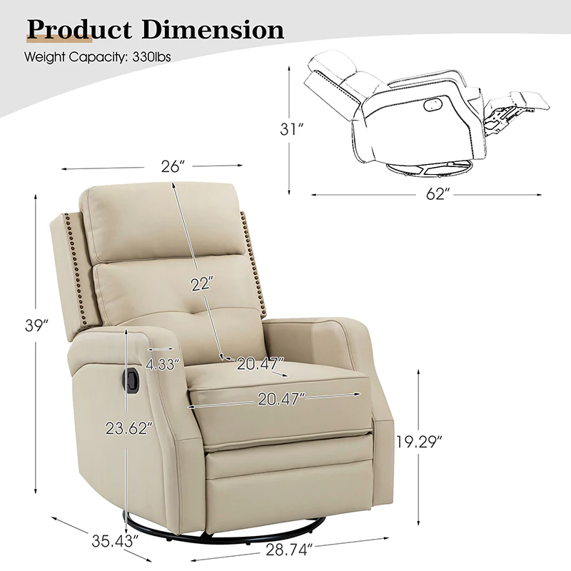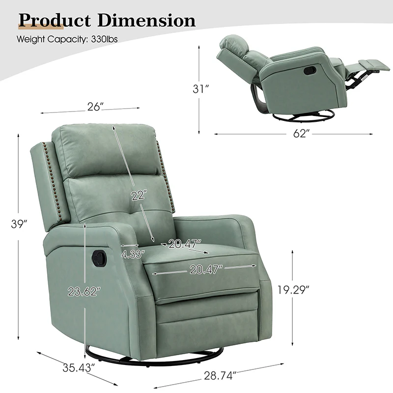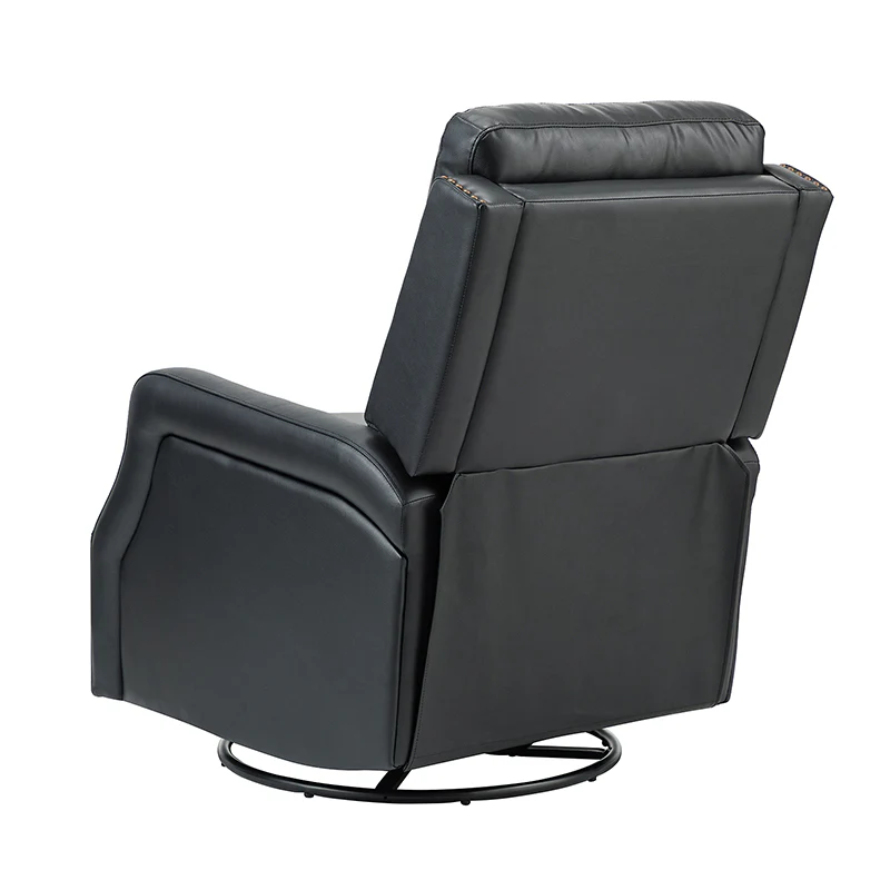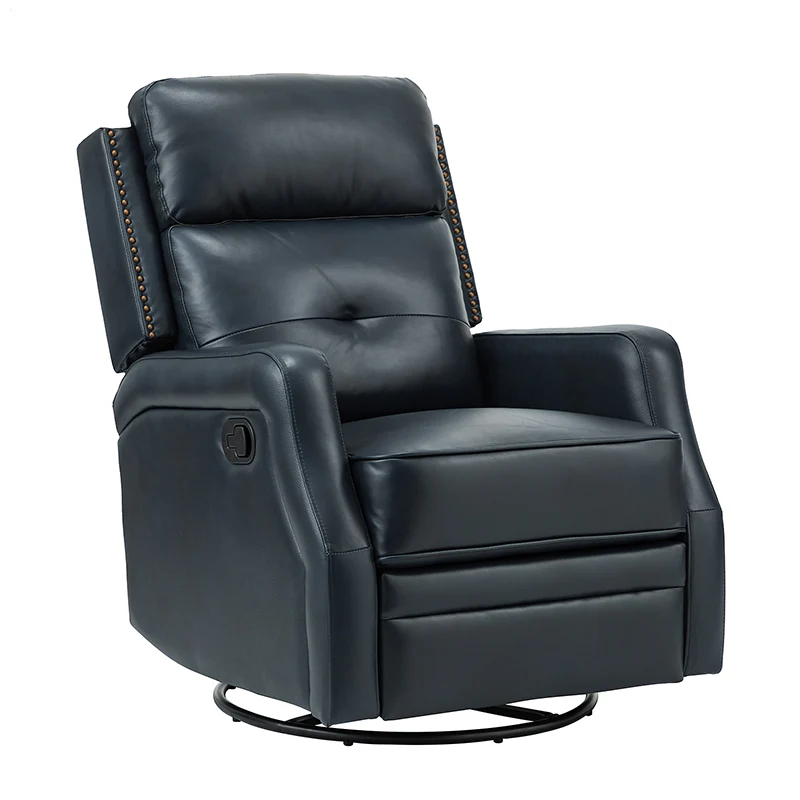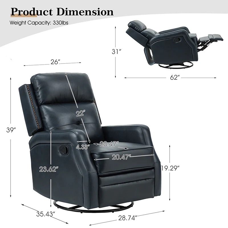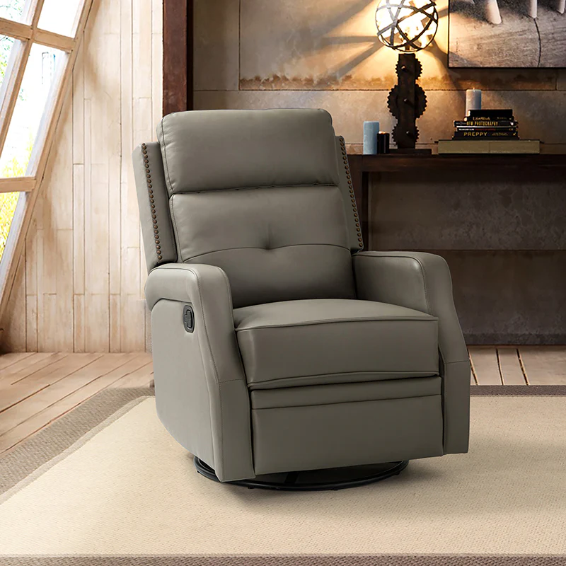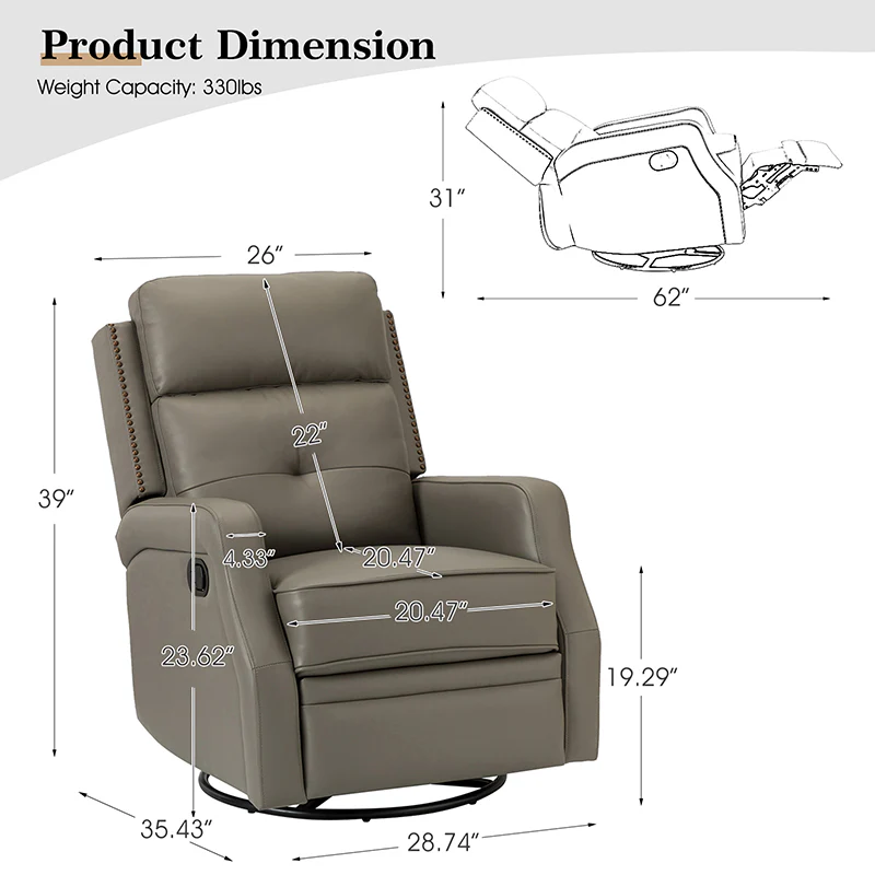 Sit back and relax during movie night in the living room or den with this genuine leather recliner. Available in 5 position states allowing you to recline and relax manually, this recliner exudes luxury and comfort whether sitting or reclining. Smooth genuine leather adds sophistication and lets you relax without breaking the bank. Crafted from sturdy wood and metal, this recliner has a modern look with mid-century elements, adding a simple yet stylish appeal to any living room. Gorgeous nailhead accents outline beautiful shapes and add rich and whimsical character to your space. Plus, it's the perfect recliner for grabbing some freshly buttered popcorn with the whole family on a Friday night, having fun, and watching a movie together.
