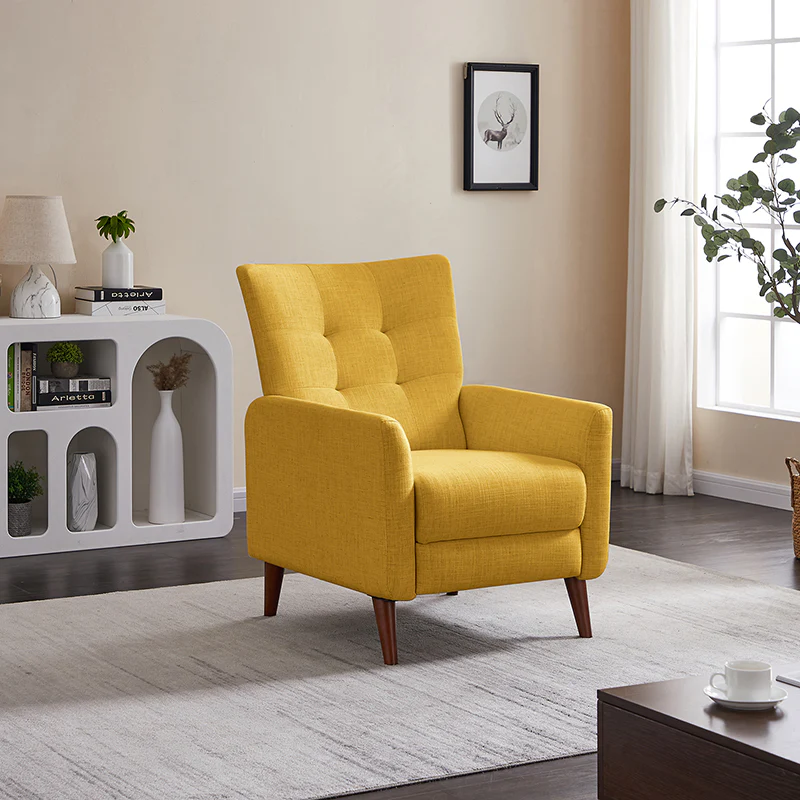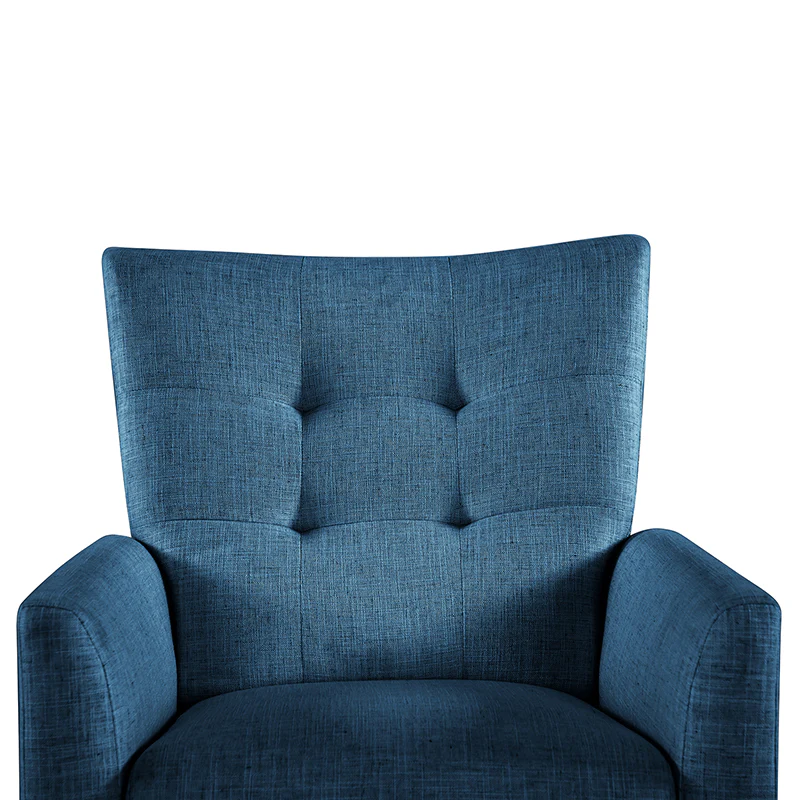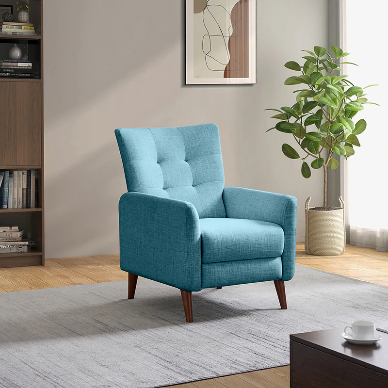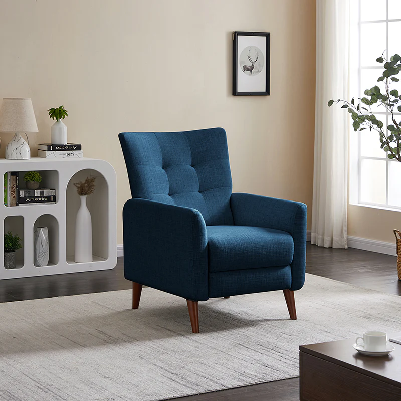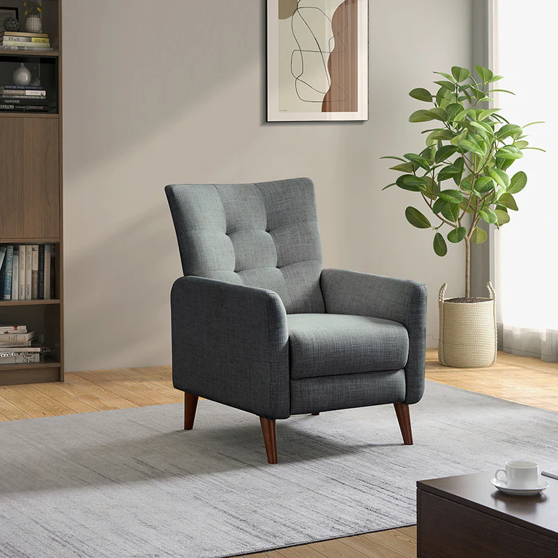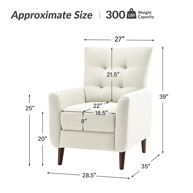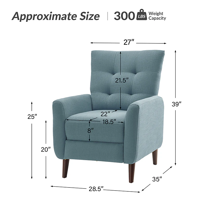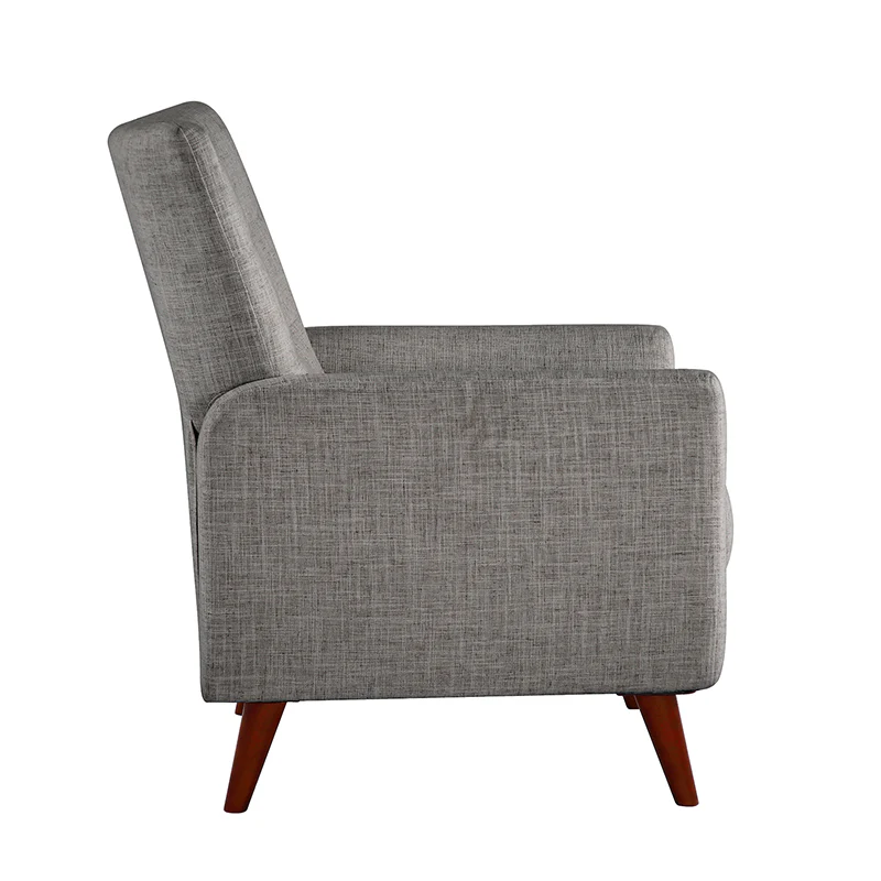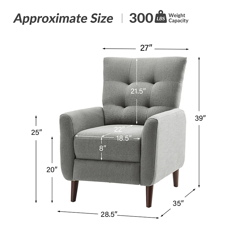 This reclining chair mixes contemporary styling with the comfort and support that you look for in a recliner. Sit back and relax in this contemporary manual recliner. Simply push back to recline and enjoy two types of positions, no levers or buttons are required? Allowing you to find the right angle for reading, watching TV, or taking a catnap. The simple elegant back is very comfortable to lean on, while the tufted back is for a dash of distinction. It is made of solid and manufactured wood, with foam material over pocket springs in the seat for even more comfort. The style lends itself to both contemporary and more modern living. Great for living rooms, media rooms, and master bedrooms. Clean styling offers a generous seat size and comfort.