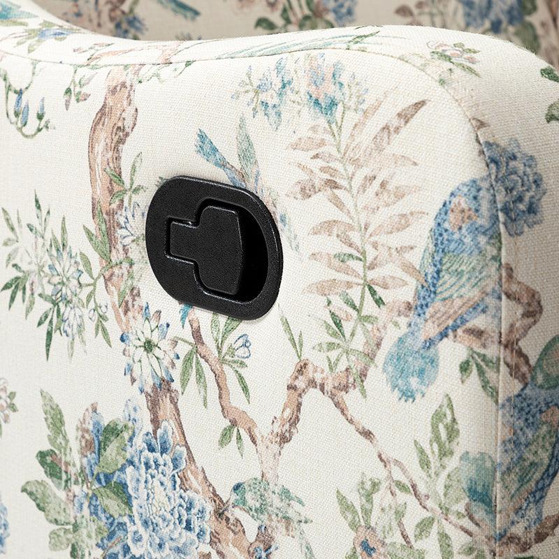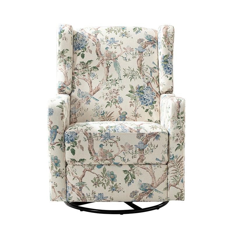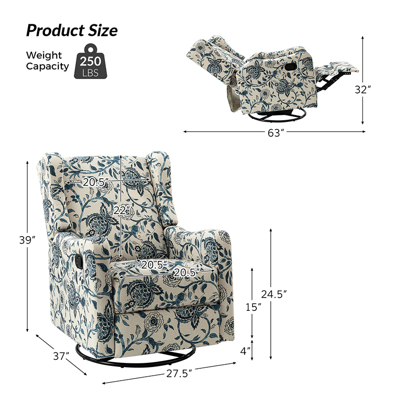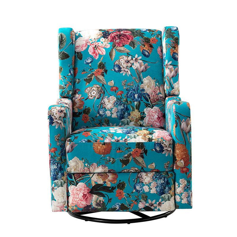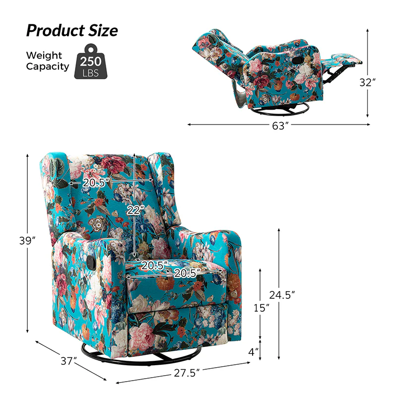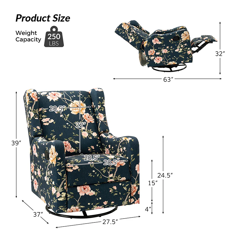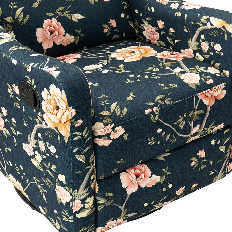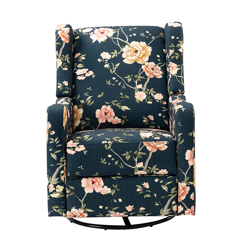 The comfy recliner offers a vintage look that is very practical for your home. It features a unique wingback design and floral patterned design which will blow you away. This nursery chair is a push-back recliner that allows you to lay back and relax after a long day. Simply pull the armrest side handles gently and use your weight to push the recliner back to recline. Tilt your weight forward and up to bring it back to an upright position. This recliner offers the ultimate comfort with a wonderfully relaxing glide feature and a convenient swivel function. Ideal for discovering the perfect position for you, this recliner will quickly become your new favorite recliner in the house.