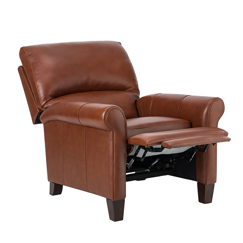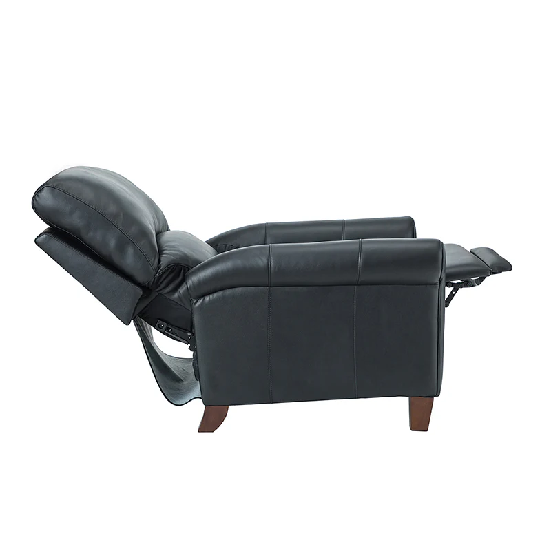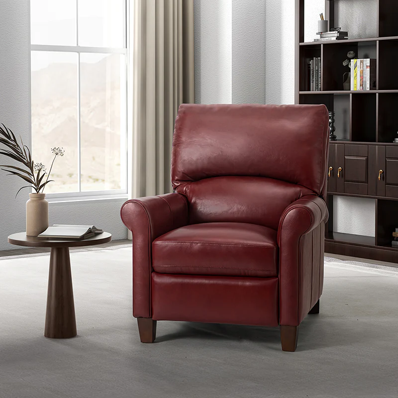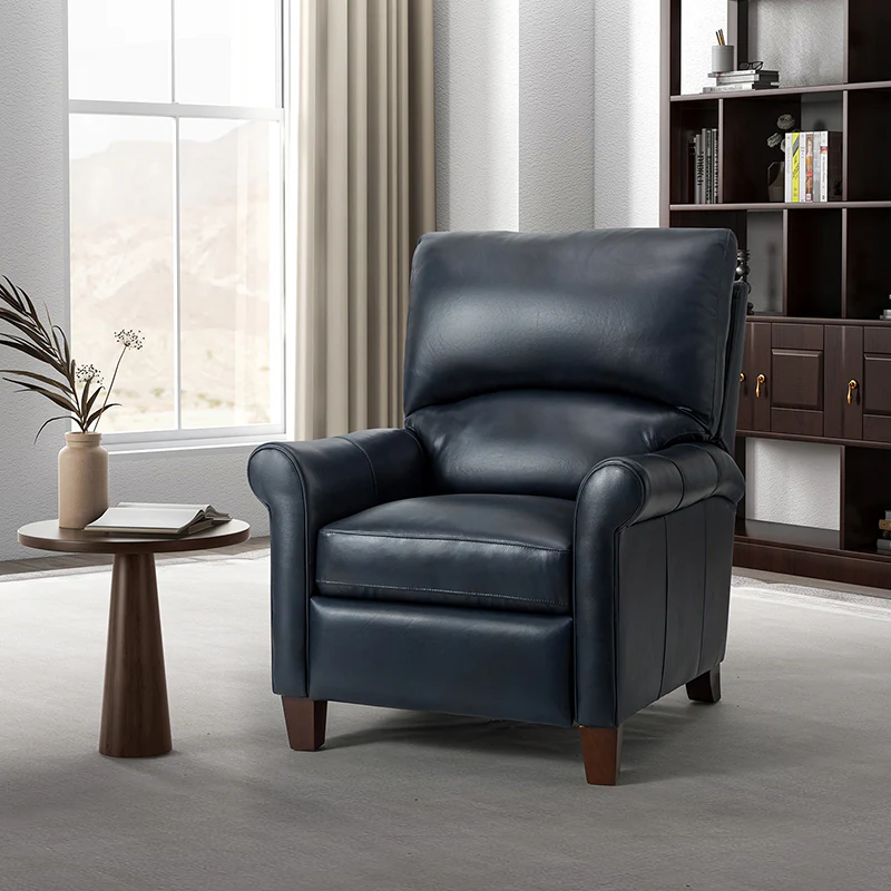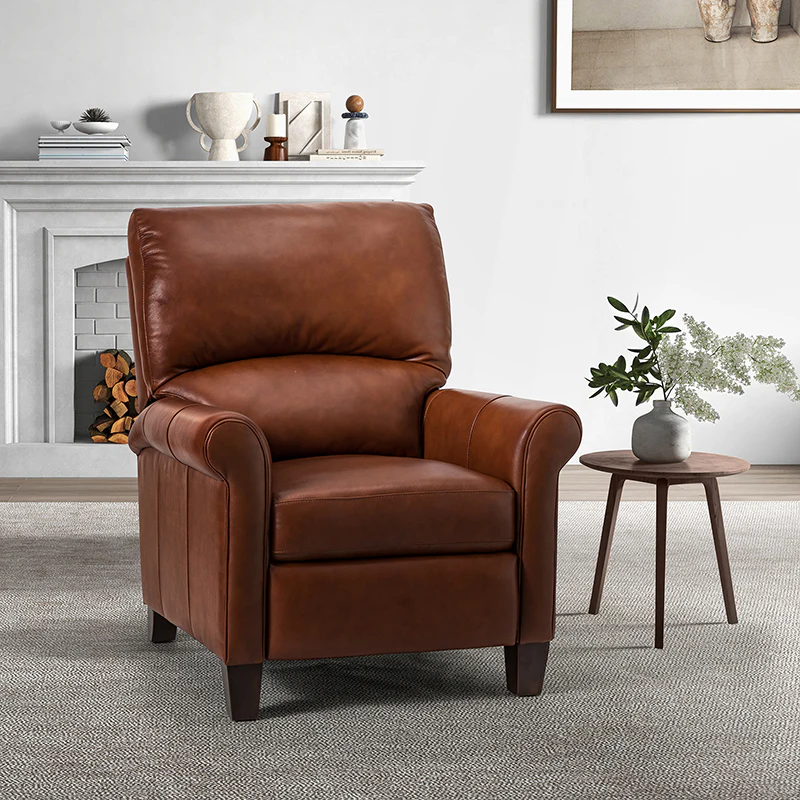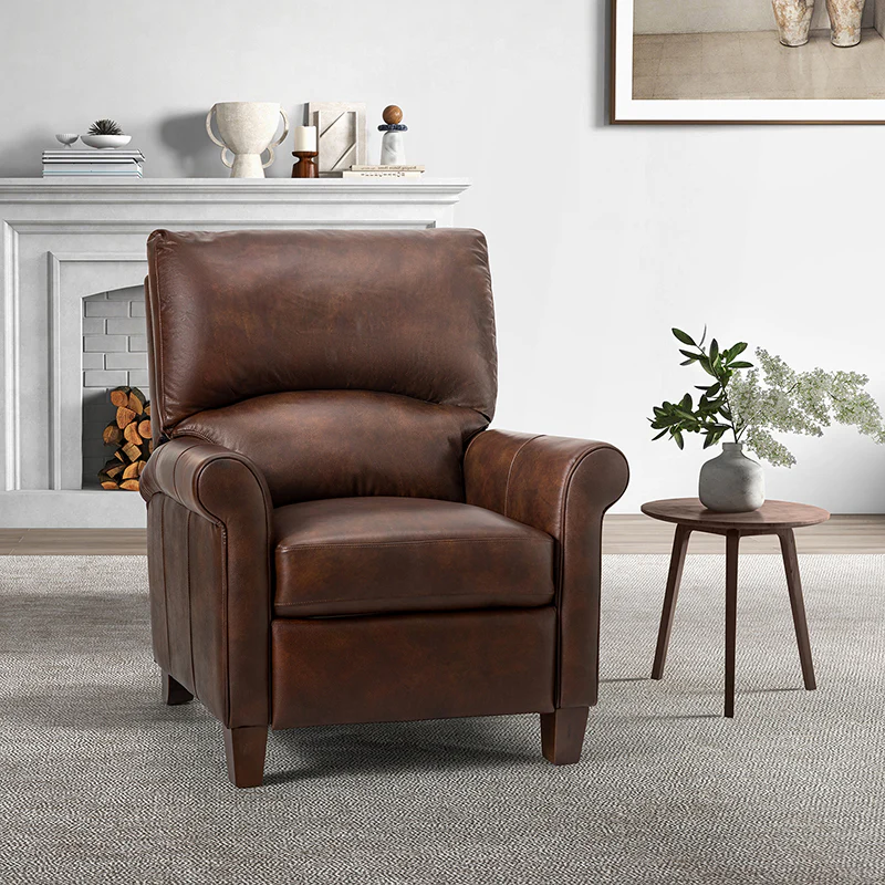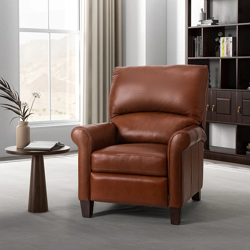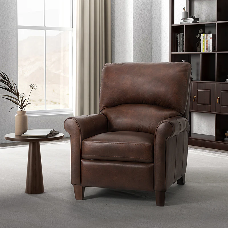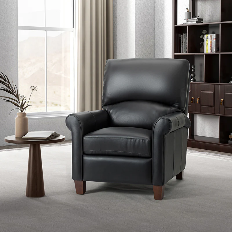 This recliner combines modern and light luxury elements. This recliner fits in whether it's your living room, office, home office, or study. Let you enjoy everything the room has to offer. This piece is outfitted with solid wood legs and a hardwood frame for ensured strength and stability as well as a natural rustic aesthetic. Enjoy a sturdy foundation with a traditional look that fits wonderfully in a variety of settings. A sturdy, supportive seat cushion balances softness and durability, making any room or home office feel more comfortable and inviting. Moreover, all seating area is upholstered with genuine leather. You can use your body to touch the skin-friendly experience of genuine leather. The recliner will relax every cell in your body and improve the quality of your daily life and rest. You can relax by reclining immediately when you push forward. The recliner makes an easy addition to any room as a captivating, versatile piece of decor.