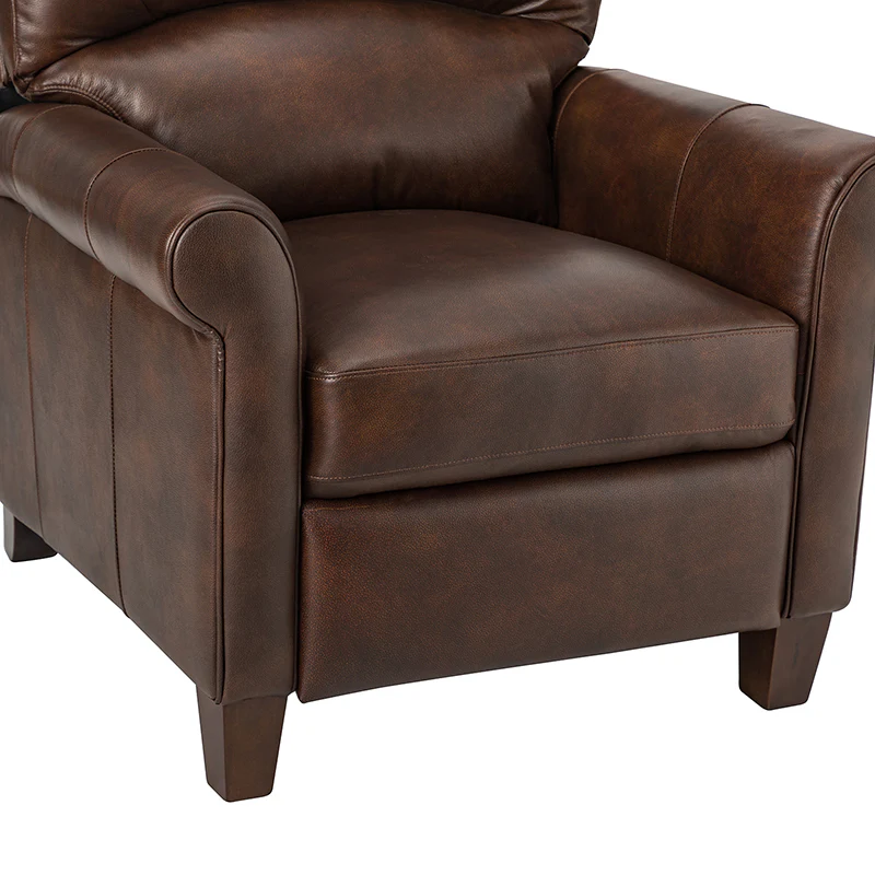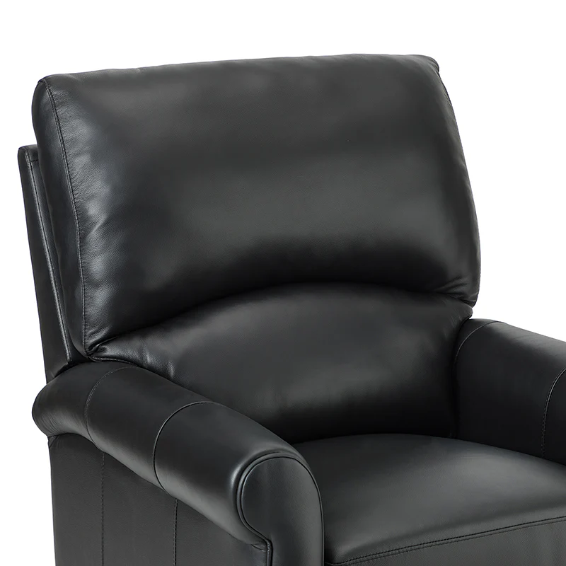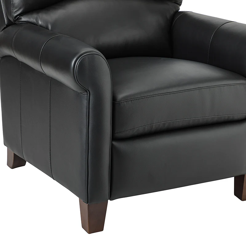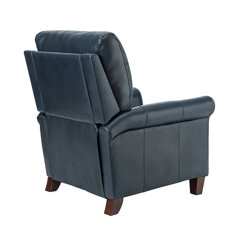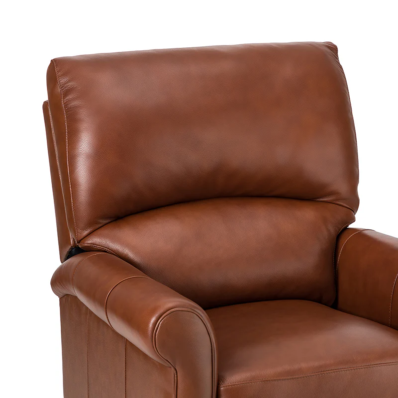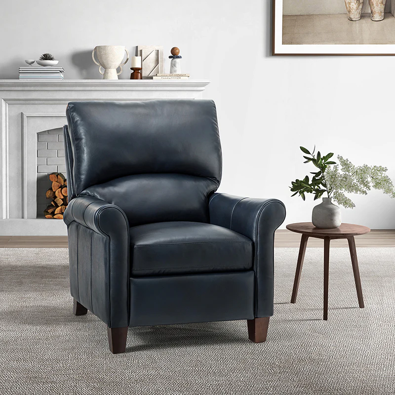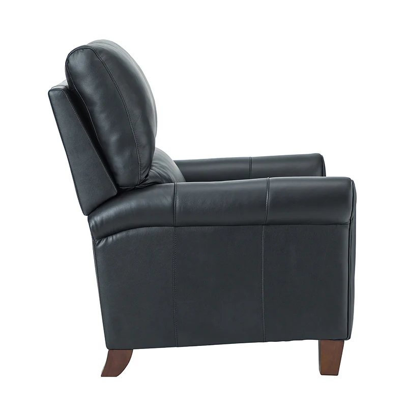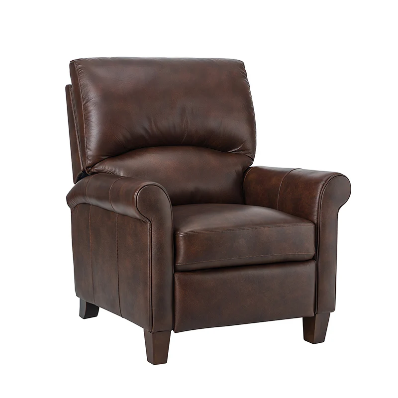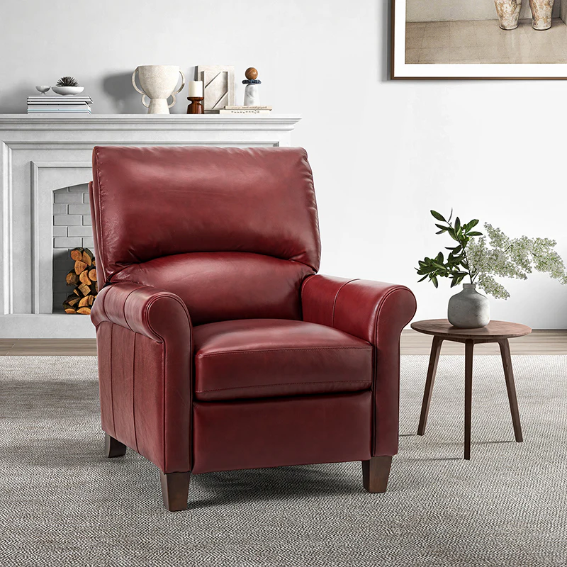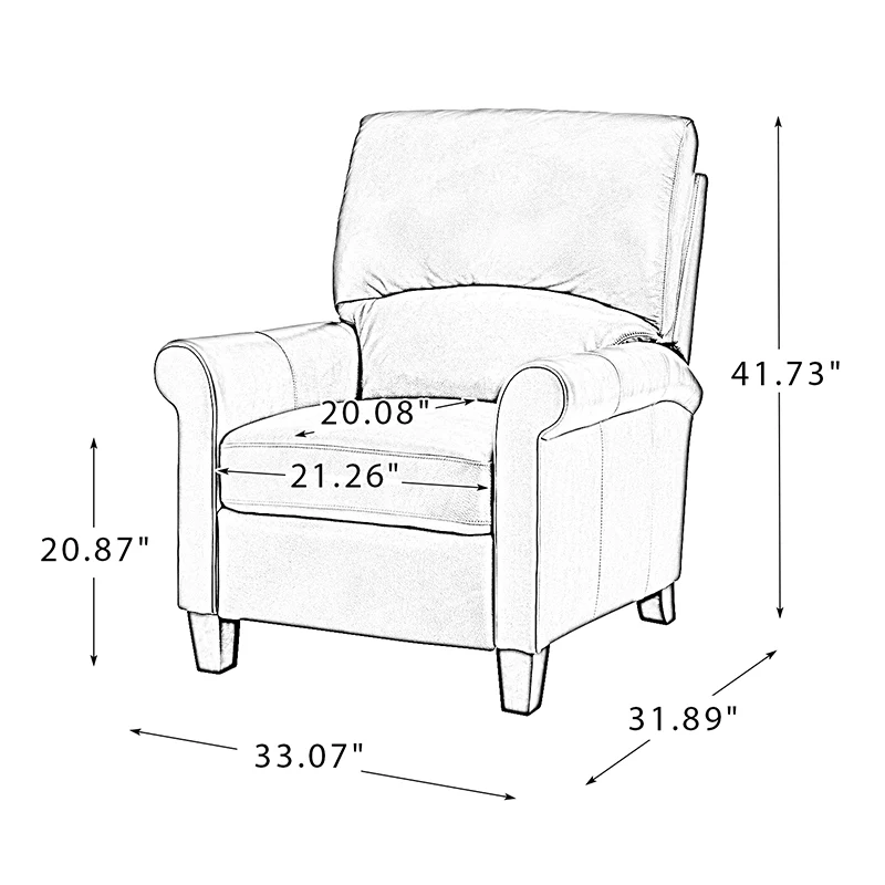 This recliner combines modern and light luxury elements. This recliner fits in whether it's your living room, office, home office, or study. Let you enjoy everything the room has to offer. This piece is outfitted with solid wood legs and a hardwood frame for ensured strength and stability as well as a natural rustic aesthetic. Enjoy a sturdy foundation with a traditional look that fits wonderfully in a variety of settings. A sturdy, supportive seat cushion balances softness and durability, making any room or home office feel more comfortable and inviting. Moreover, all seating area is upholstered with genuine leather. You can use your body to touch the skin-friendly experience of genuine leather. The recliner will relax every cell in your body and improve the quality of your daily life and rest. You can relax by reclining immediately when you push forward. The recliner makes an easy addition to any room as a captivating, versatile piece of decor.