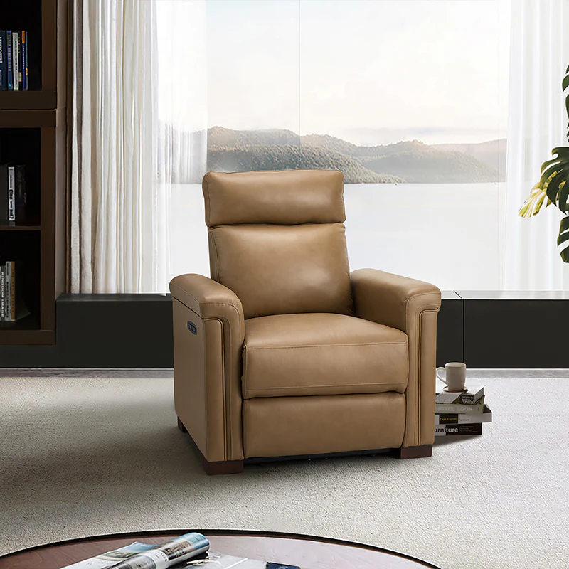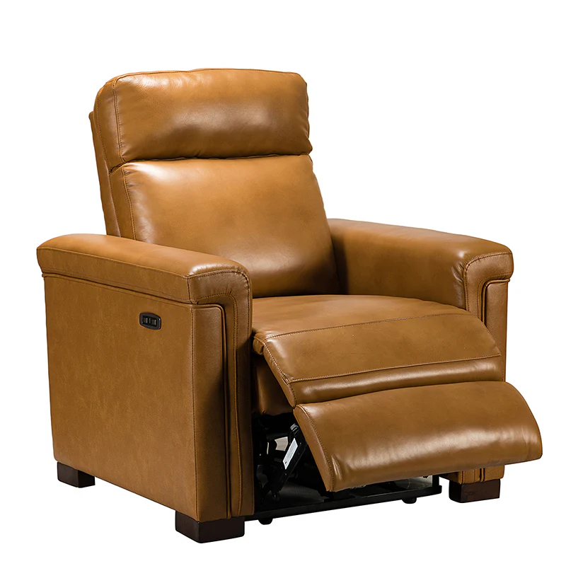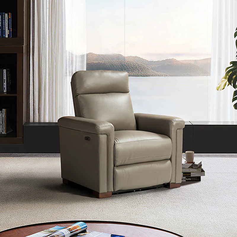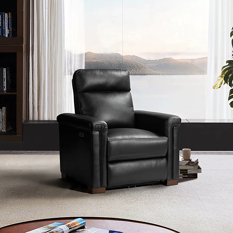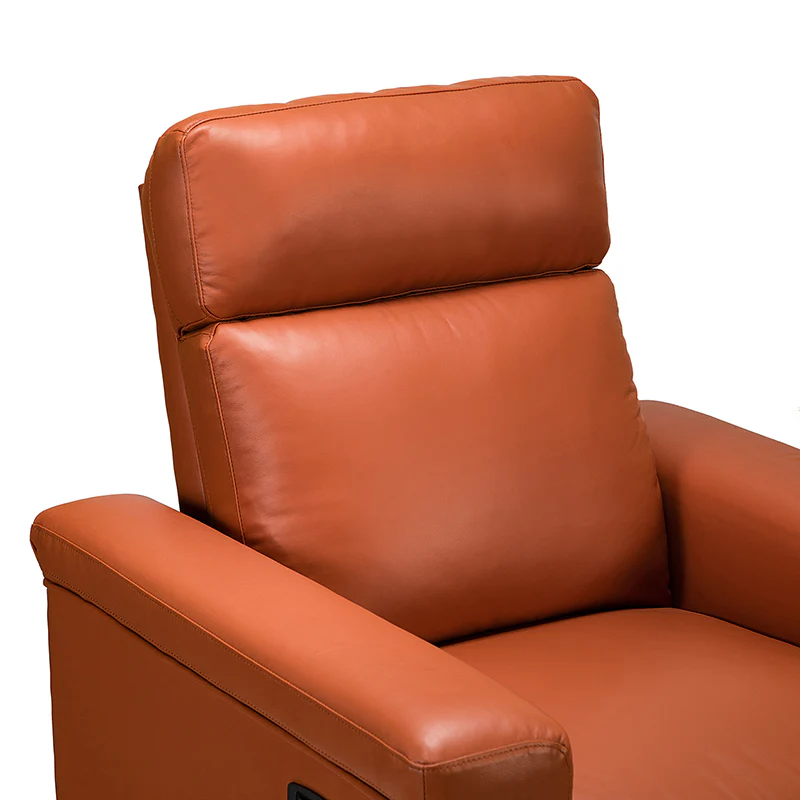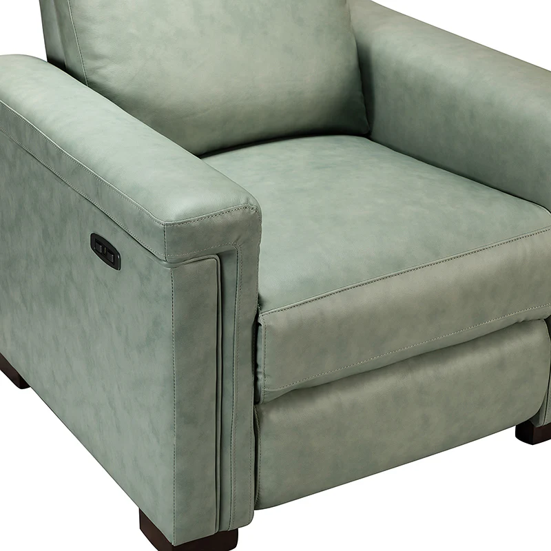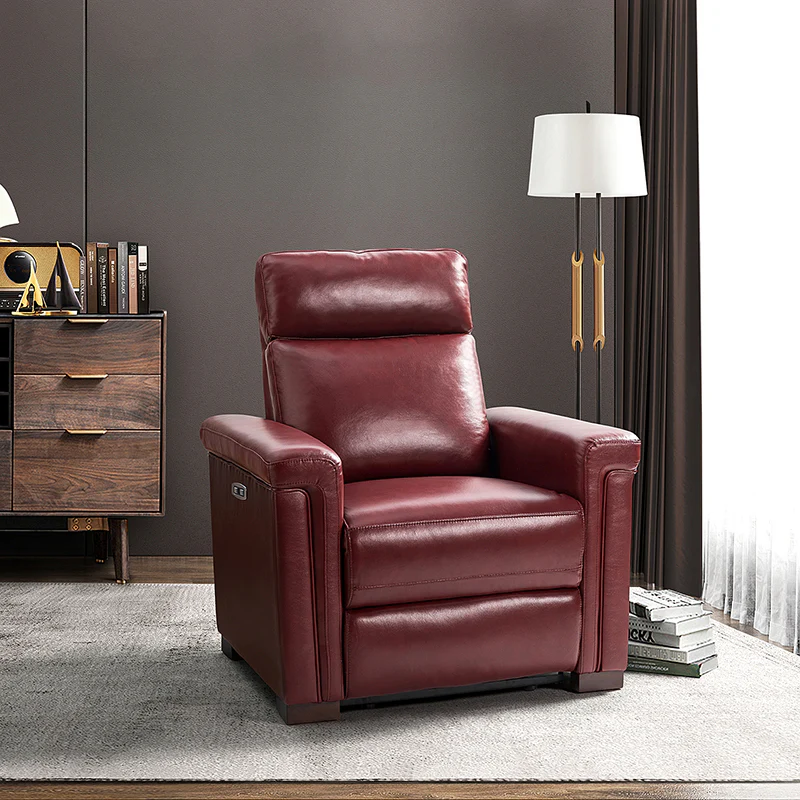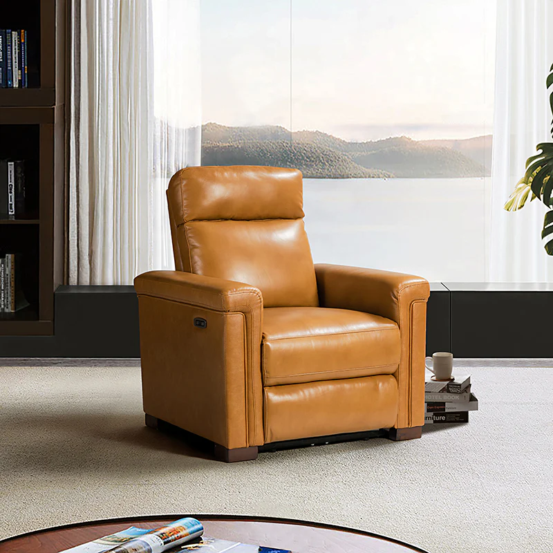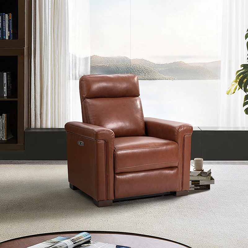 Whether catching your favorite shows after a long day or kicking back with the latest bestseller on your day off, this power cigar recliner offers the perfect perching point in your home. Its two cushions padded back, foam, and polyester fiber-filled frame exude ease and comfort when both upright and in the reclining position, while the built-in sinuous spring increases stability. Crafted from solid and manufactured wood and upholstered with luxurious breathable genuine top layer leather, this comfy power recliner shows a modern appearance for simple yet fashionable charm in any living room. Including a 2.1-meter-long wire to connect the electricity, it provides an adjustable reclining angle of a maximum of 150 degrees and paired USB port, you can fix it at any angle within the range and enjoy its convenient charging function. Cooperating with the hidden footrest to relax your joints after a long day of work, it is the best place to rock away from the day's pressure after work.