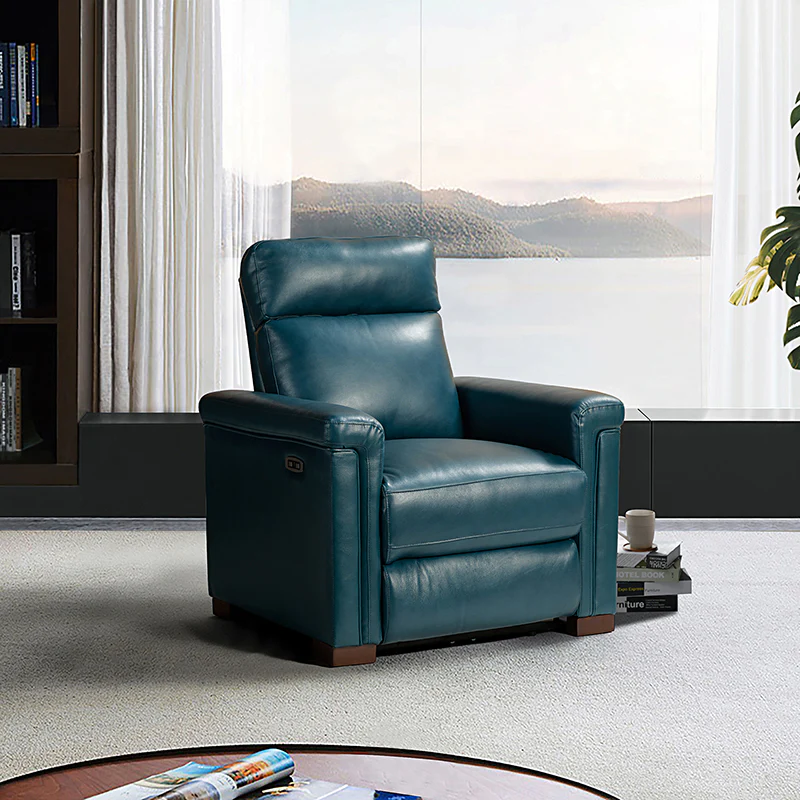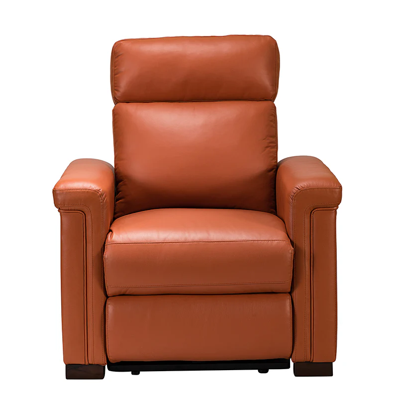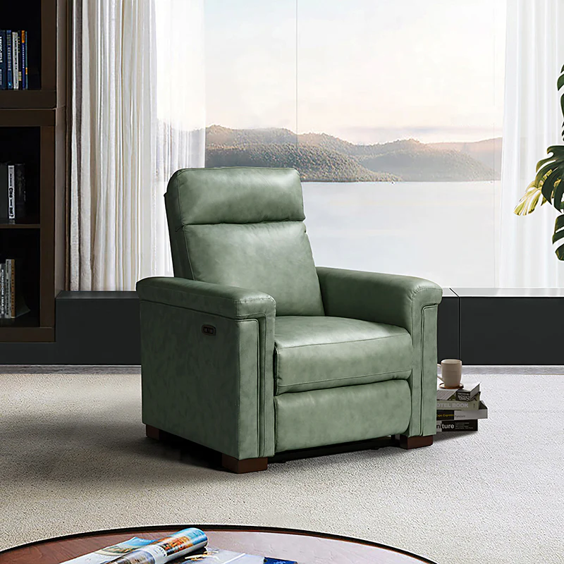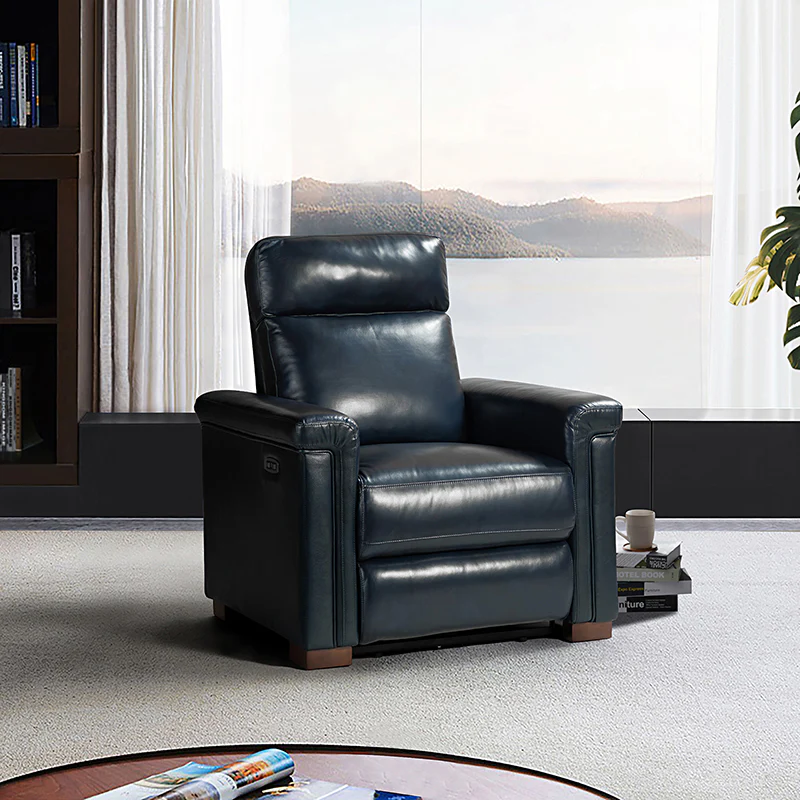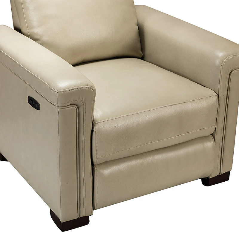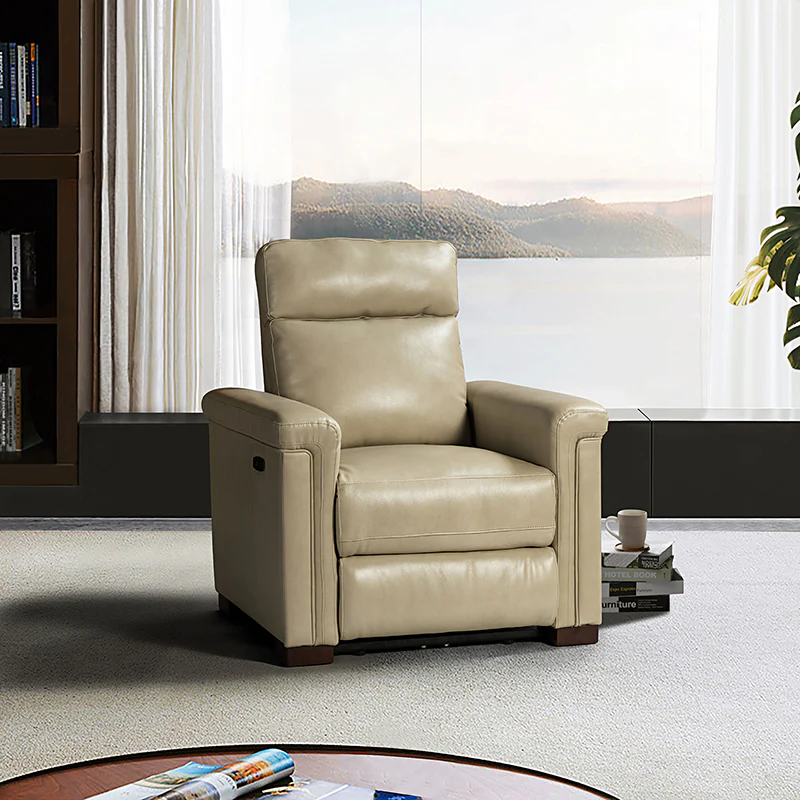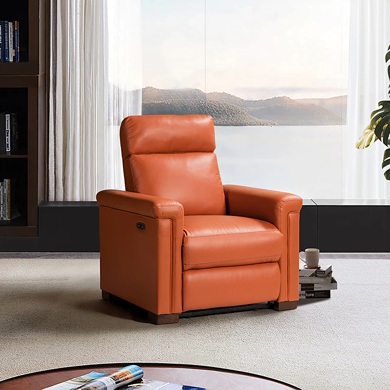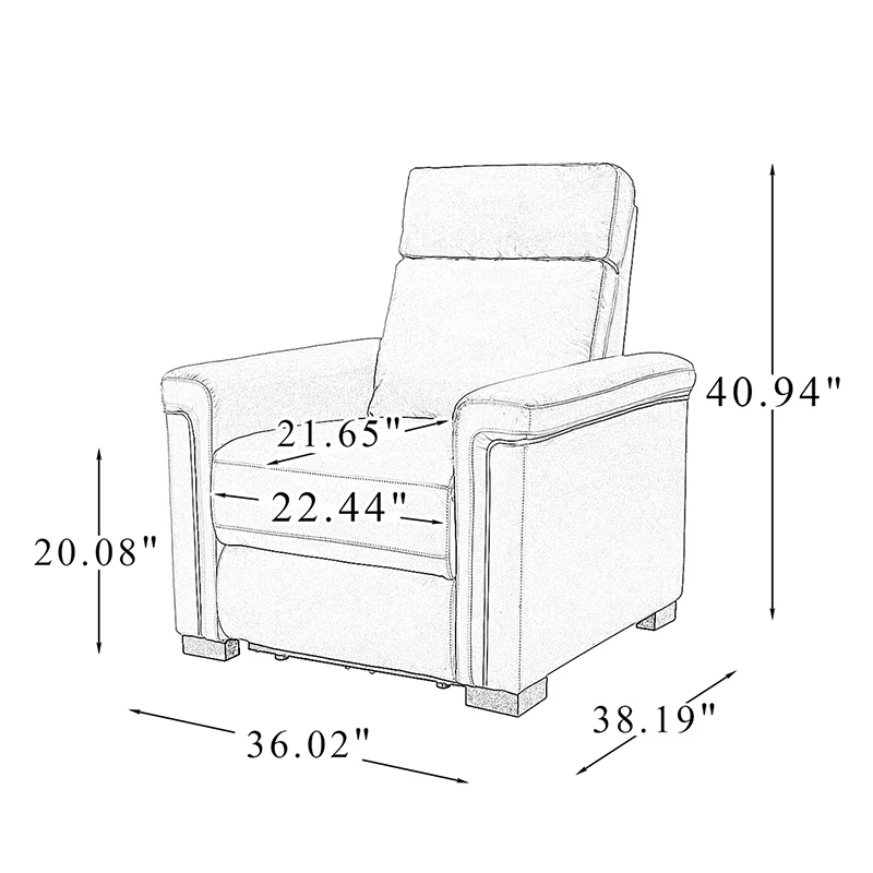 Whether catching your favorite shows after a long day or kicking back with the latest bestseller on your day off, this power cigar recliner offers the perfect perching point in your home. Its two cushions padded back, foam, and polyester fiber-filled frame exude ease and comfort when both upright and in the reclining position, while the built-in sinuous spring increases stability. Crafted from solid and manufactured wood and upholstered with luxurious breathable genuine top layer leather, this comfy power recliner shows a modern appearance for simple yet fashionable charm in any living room. Including a 2.1-meter-long wire to connect the electricity, it provides an adjustable reclining angle of a maximum of 150 degrees and paired USB port, you can fix it at any angle within the range and enjoy its convenient charging function. Cooperating with the hidden footrest to relax your joints after a long day of work, it is the best place to rock away from the day's pressure after work.