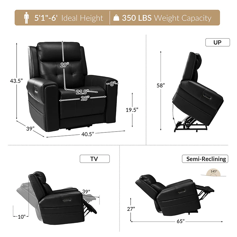 The lift-assist power recliner combines comfort and practicality, making it ideal for those recovering from surgery, managing an injury, coping with illness, or simply seeking enhanced comfort and support in their daily routine. With independent controls for adjusting the backrest and footrest, users can effortlessly find their preferred positions. Integrated massage and heating functions provide soothing relief after a long day, while the oversized design ensures ample room and robust support for users of various sizes.