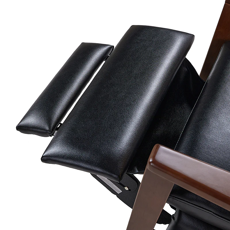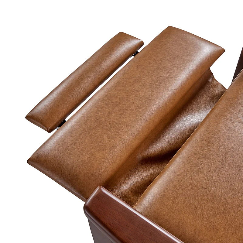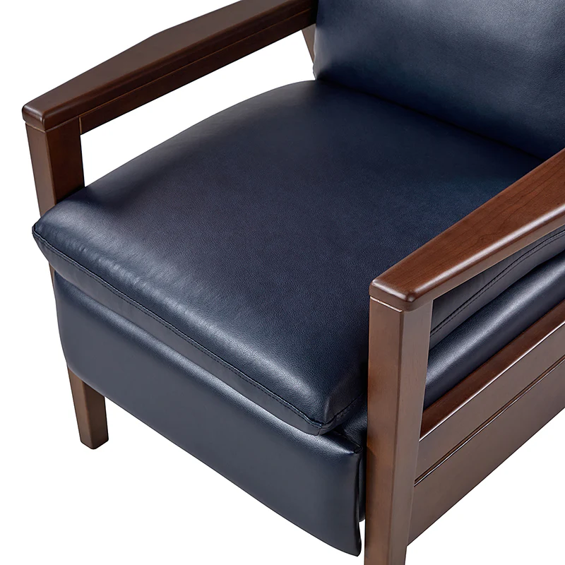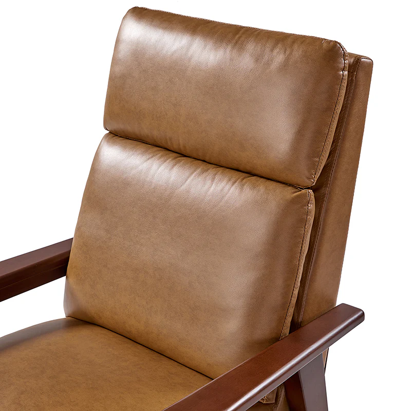 Upholstered in quality vegan leather, this mid-century modern manual recliner is aesthetically pleasing, waterproof, and easy to clean, ensuring lasting beauty. The solid wood frame handrail, crafted from sturdy rubber wood, exudes the natural beauty of timber. The ergonomic design promotes relaxation, while the hidden push-back mechanism turns this shapely piece into a comfy recliner. The high-density foam filling ensures comfort, cradling you in a cocoon of relaxation. The thoughtful addition of friction-resistant foot pads protects your floors while adding stability to the chair. Elevate your home decor with mid-century aesthetics and contemporary appeal in this vegan leather manual recliner.