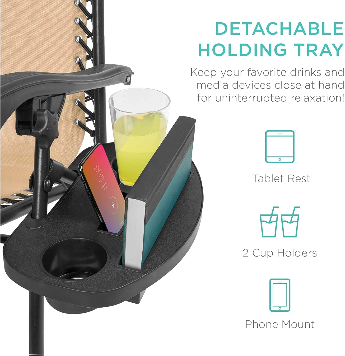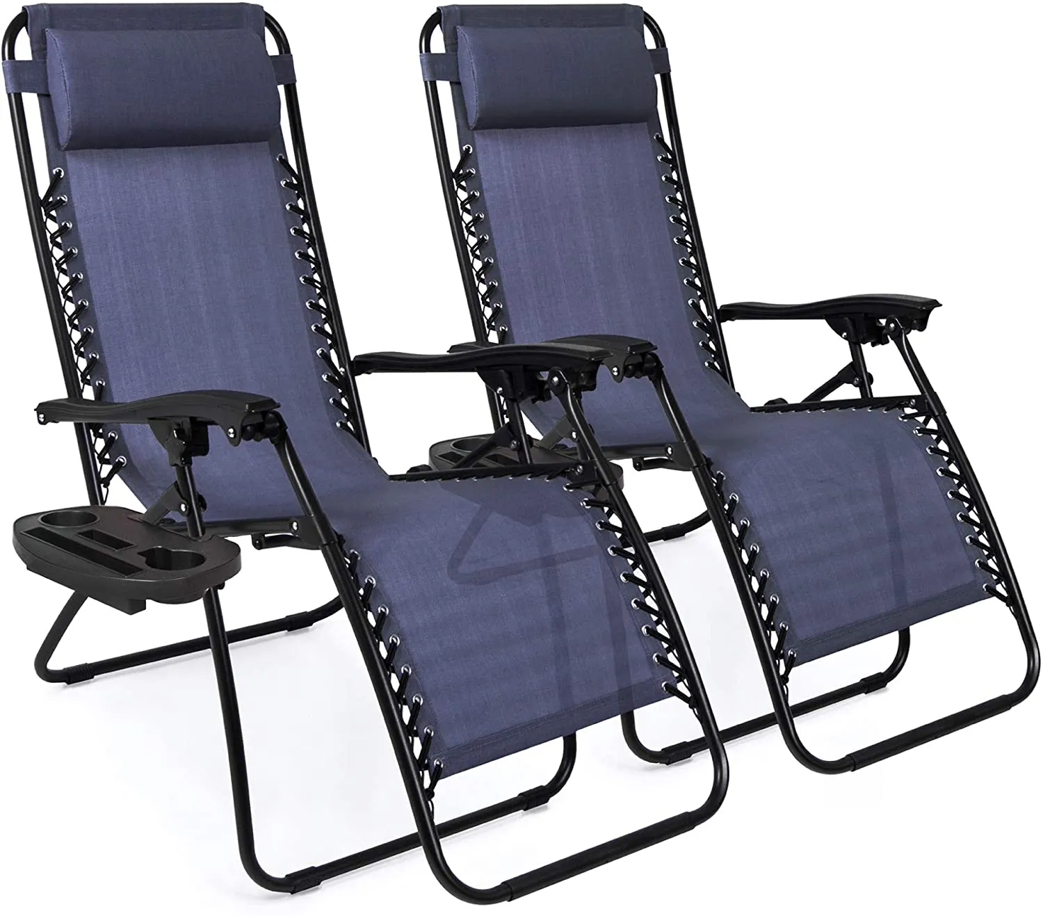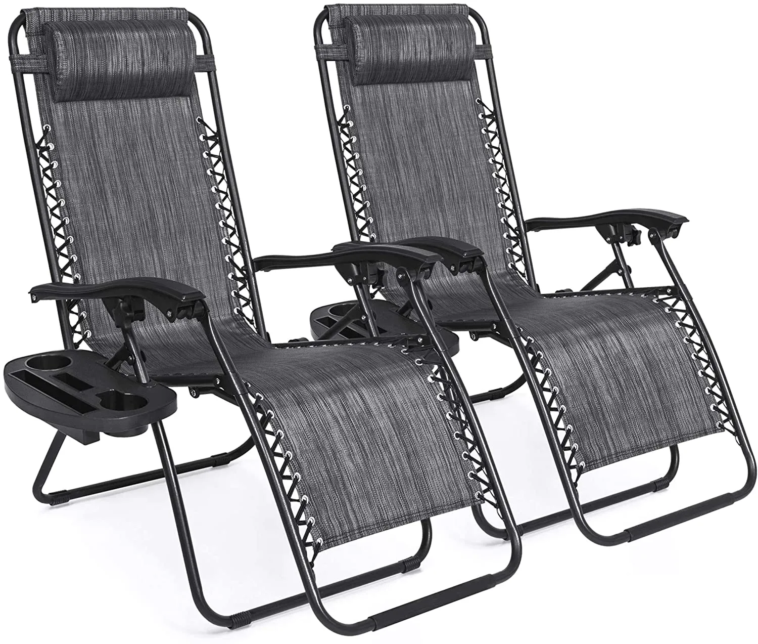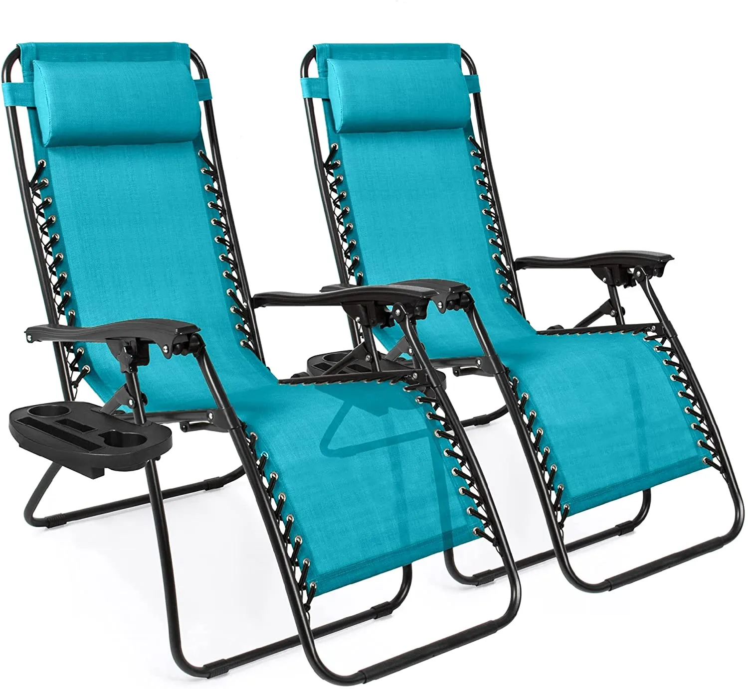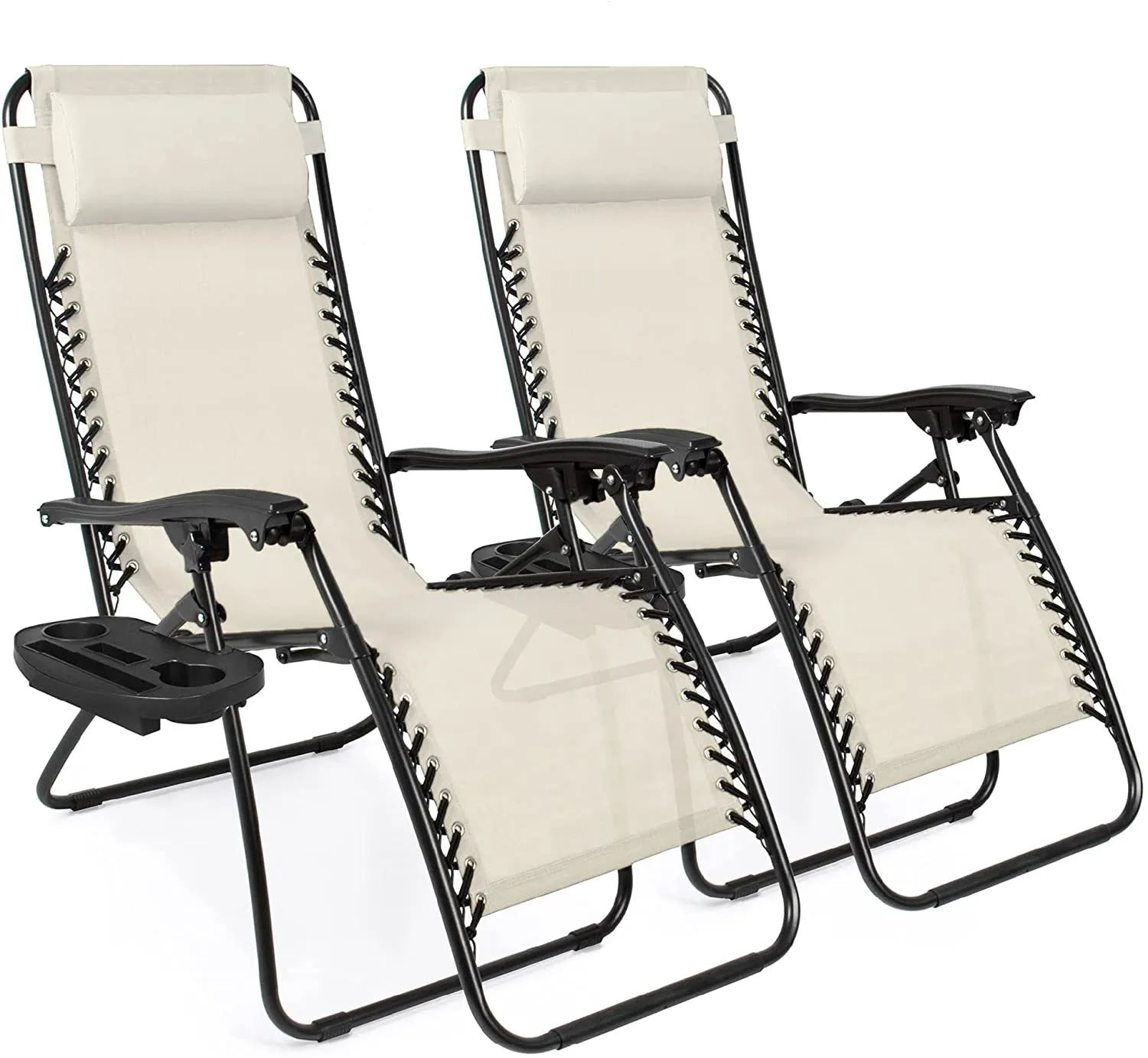 Two-piece zero-gravity lounge chair with two removable cup holders, made of durable steel pipe and excellent breathability PVC-coated polyester Fabric, which can bear a maximum weight of 350lb. It can easily adjust the angle of the recliner through the plum lock as if the weightless sitting experience allows you to release your body pressure and enjoy a rare leisure time. The foldable design allows you to carry it easily and freely to go to the beach, courtyard, or forest lawn, which is very convenient.