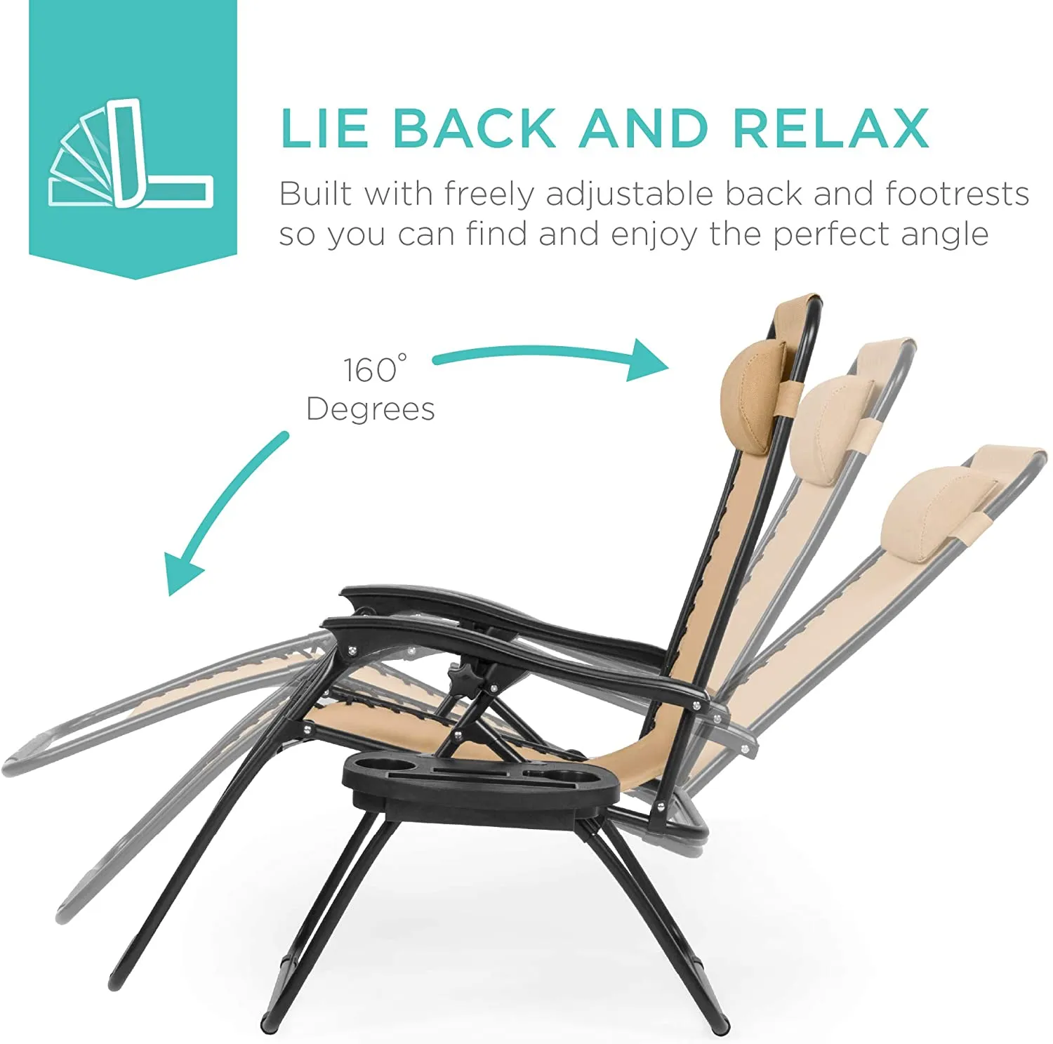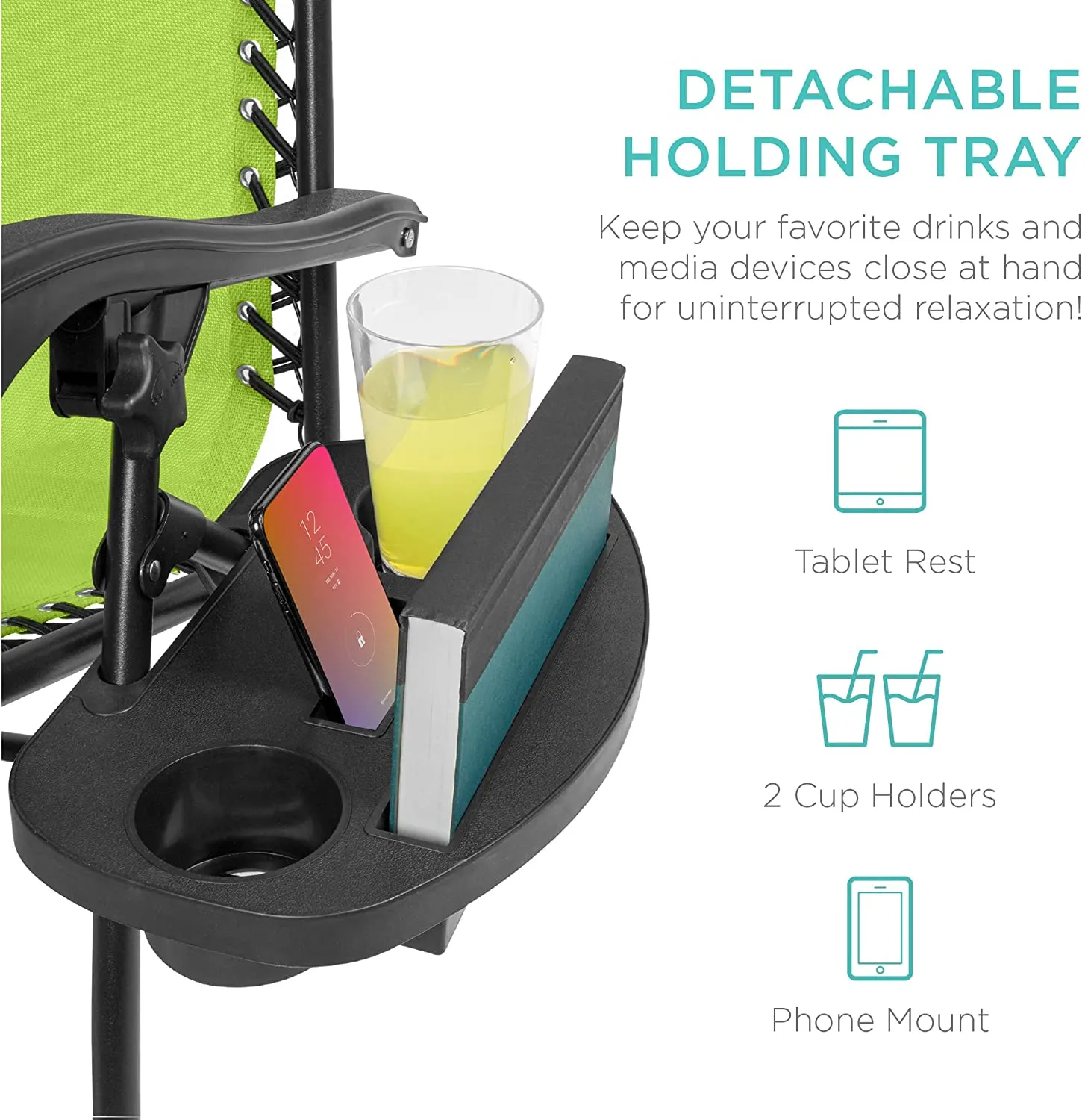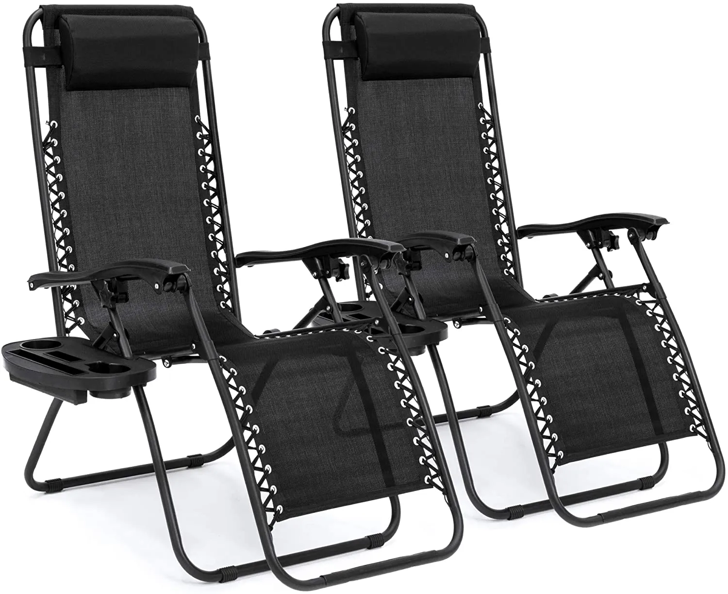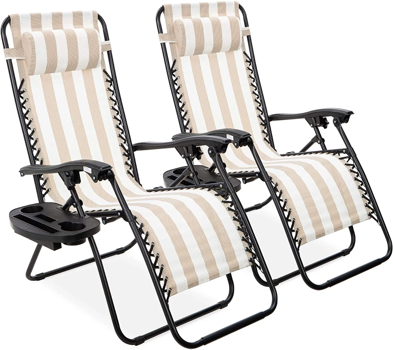 Two-piece zero-gravity lounge chair with two removable cup holders, made of durable steel pipe and excellent breathability PVC-coated polyester Fabric, which can bear a maximum weight of 350lb. It can easily adjust the angle of the recliner through the plum lock as if the weightless sitting experience allows you to release your body pressure and enjoy a rare leisure time. The foldable design allows you to carry it easily and freely to go to the beach, courtyard, or forest lawn, which is very convenient.