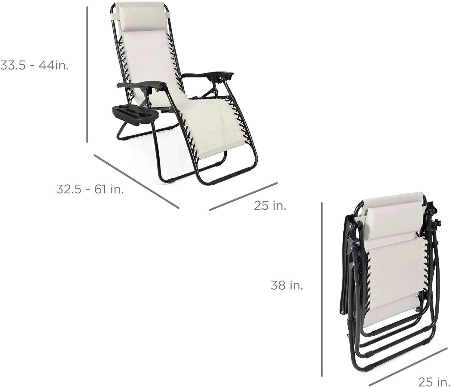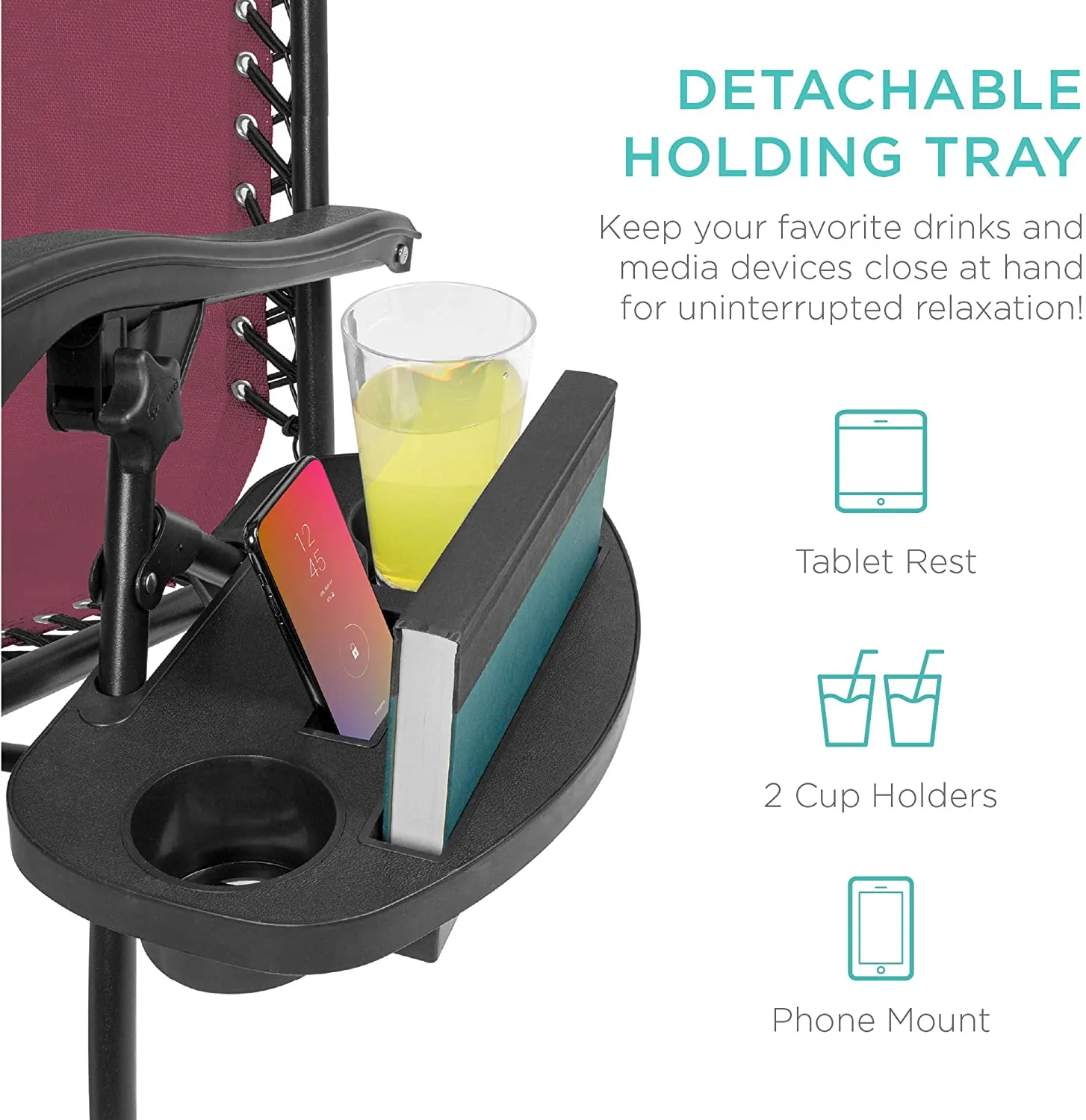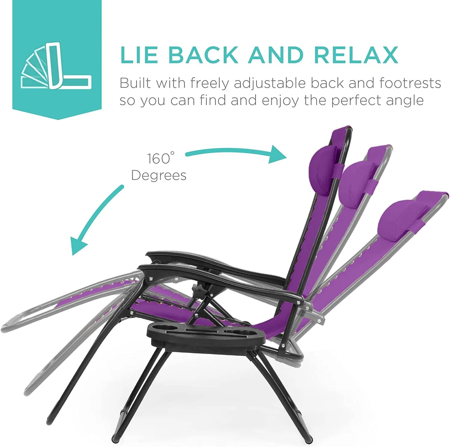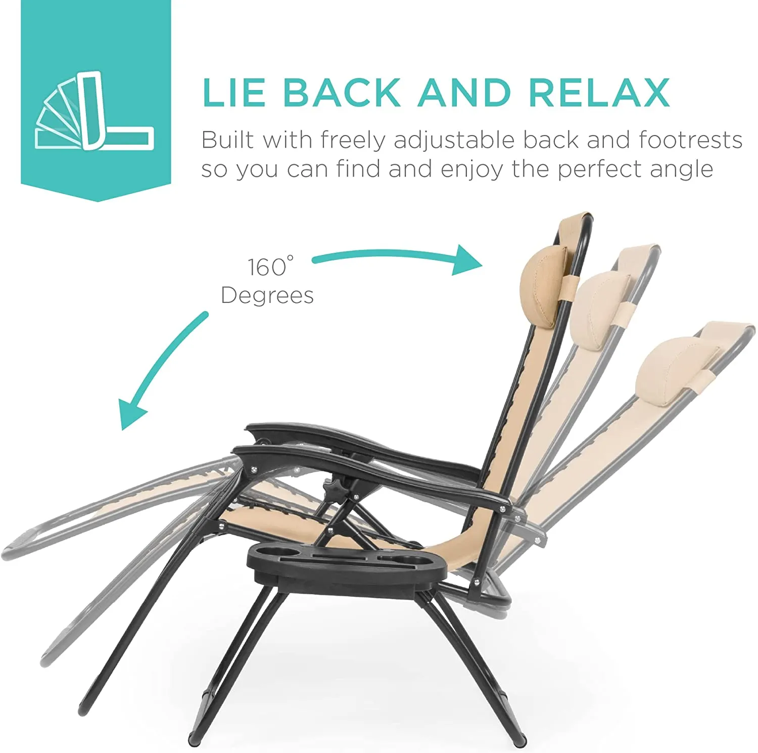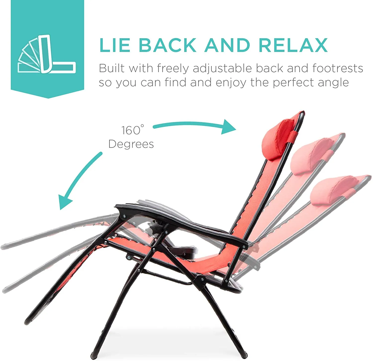 Two-piece zero-gravity lounge chair with two removable cup holders, made of durable steel pipe and excellent breathability PVC-coated polyester Fabric, which can bear a maximum weight of 350lb. It can easily adjust the angle of the recliner through the plum lock as if the weightless sitting experience allows you to release your body pressure and enjoy a rare leisure time. The foldable design allows you to carry it easily and freely to go to the beach, courtyard, or forest lawn, which is very convenient.