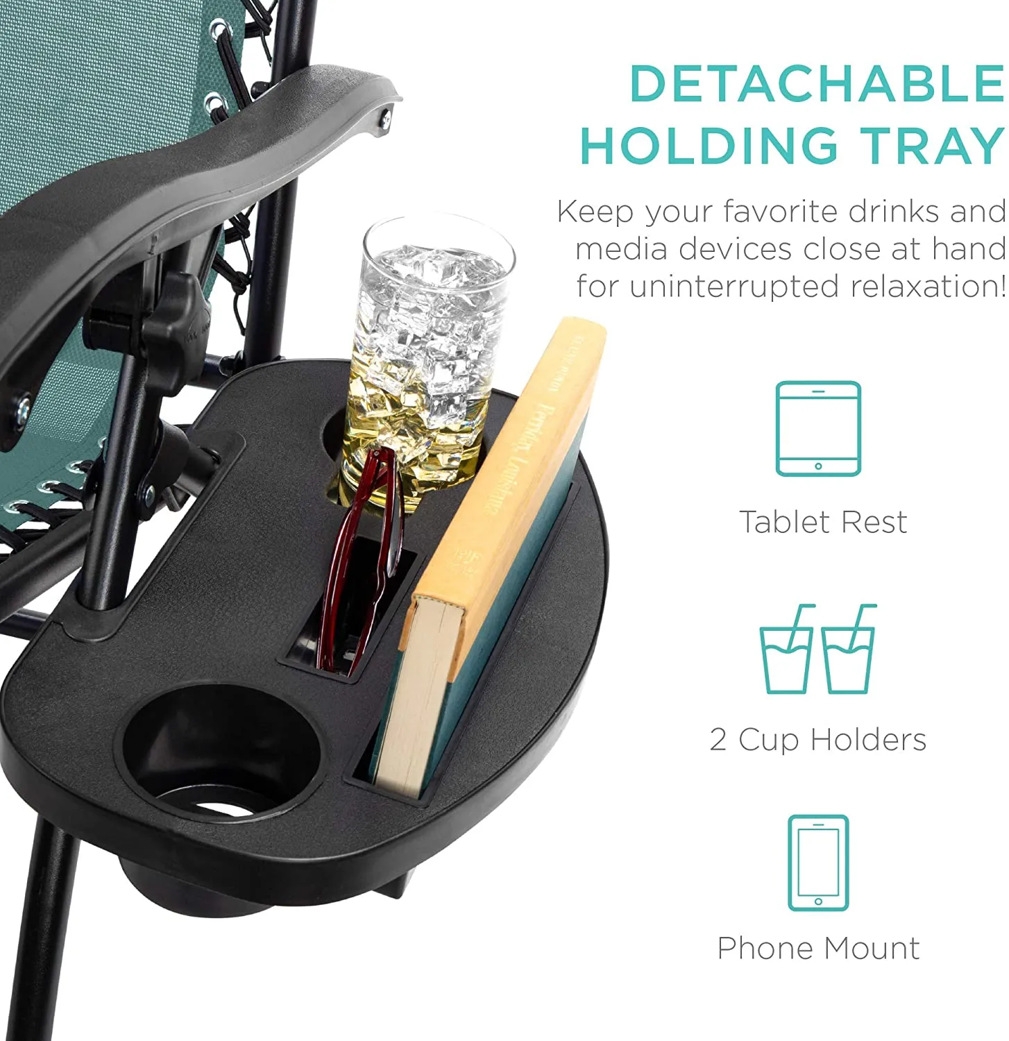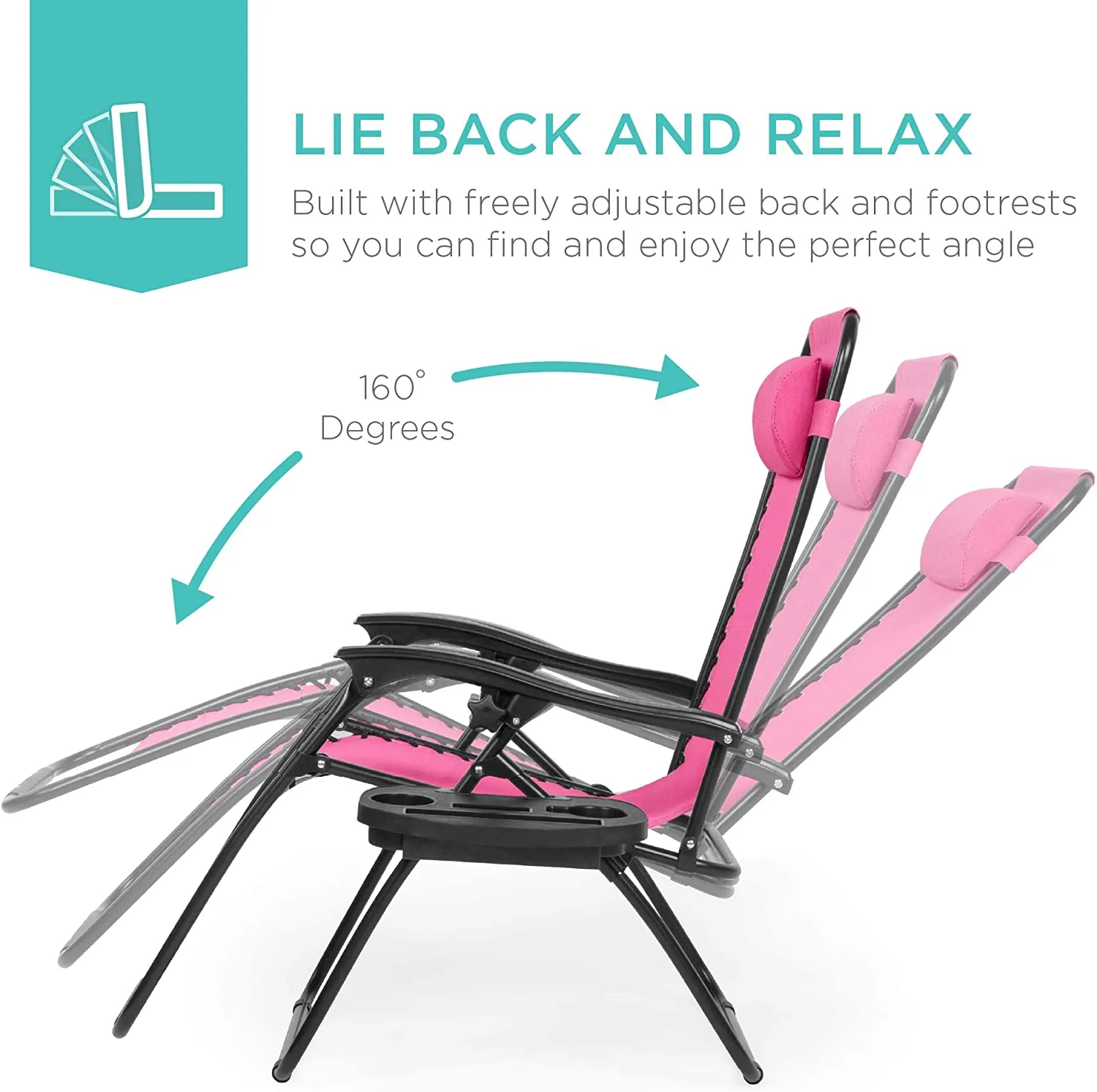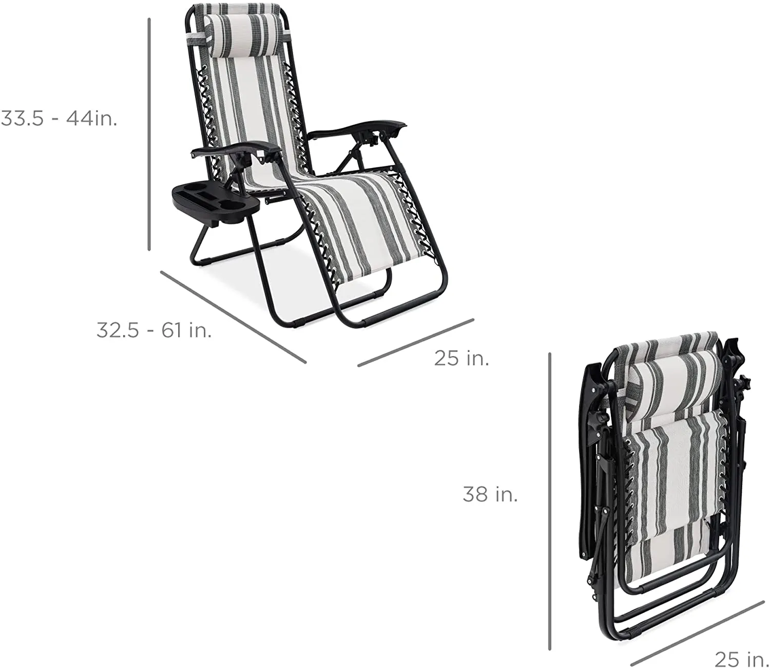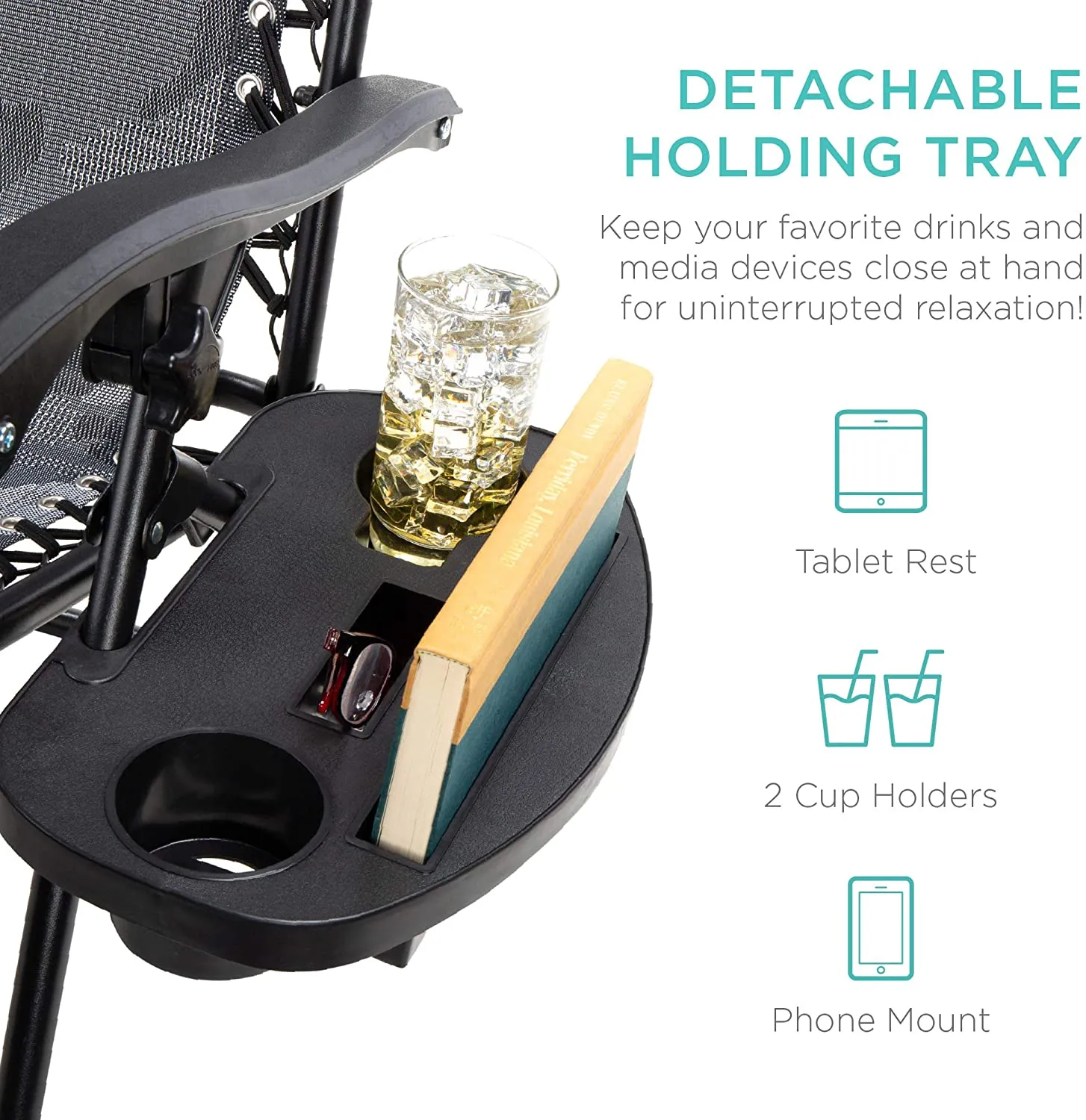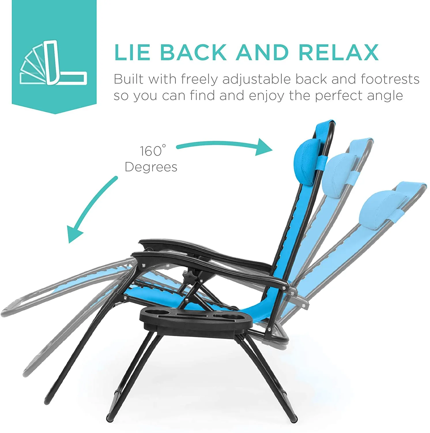 Two-piece zero-gravity lounge chair with two removable cup holders, made of durable steel pipe and excellent breathability PVC-coated polyester Fabric, which can bear a maximum weight of 350lb. It can easily adjust the angle of the recliner through the plum lock as if the weightless sitting experience allows you to release your body pressure and enjoy a rare leisure time. The foldable design allows you to carry it easily and freely to go to the beach, courtyard, or forest lawn, which is very convenient.