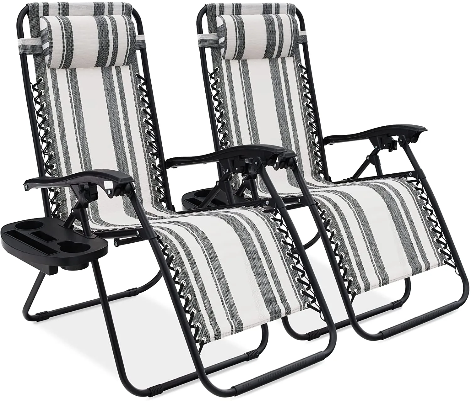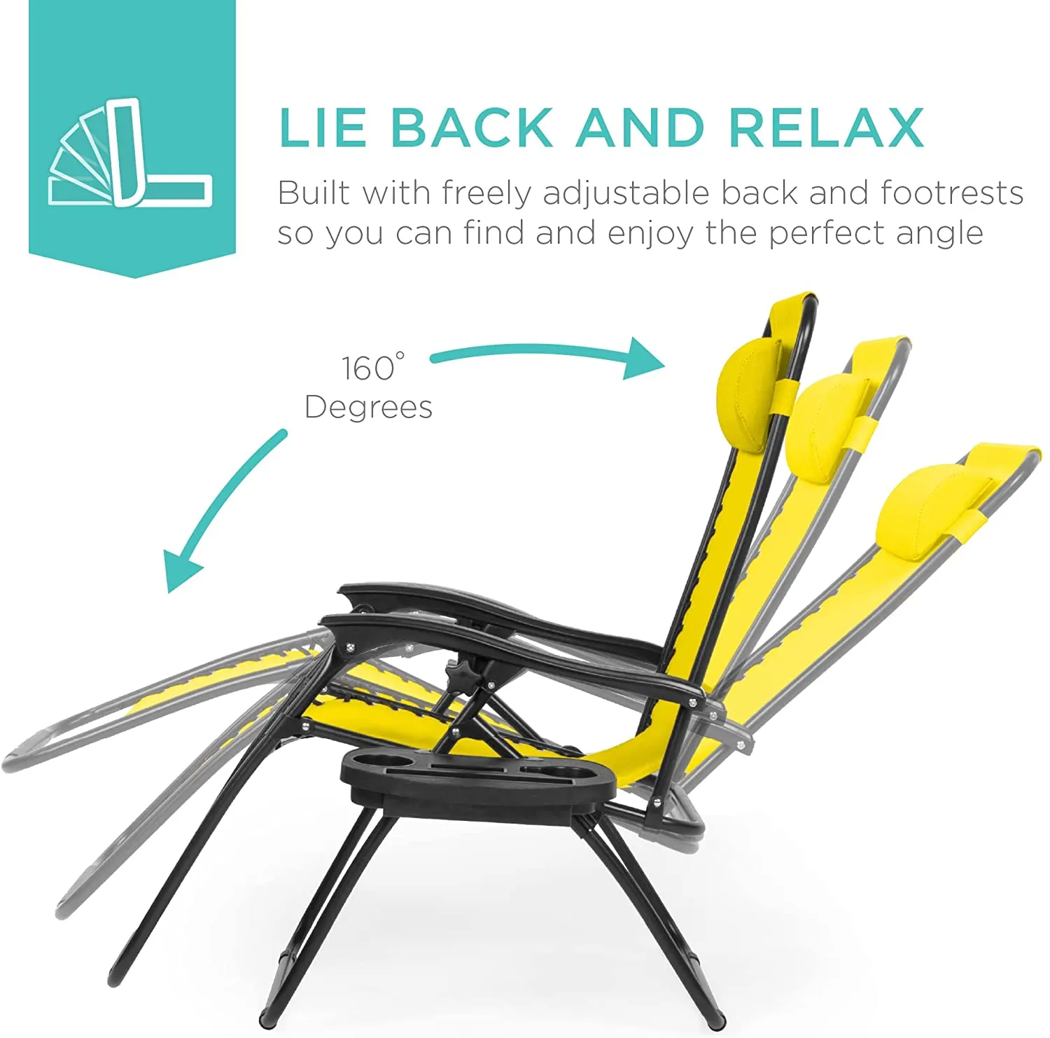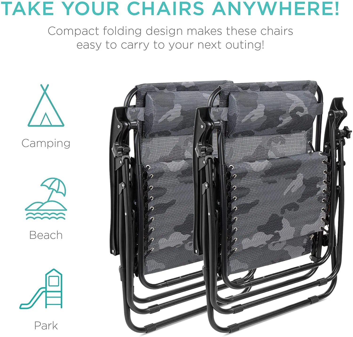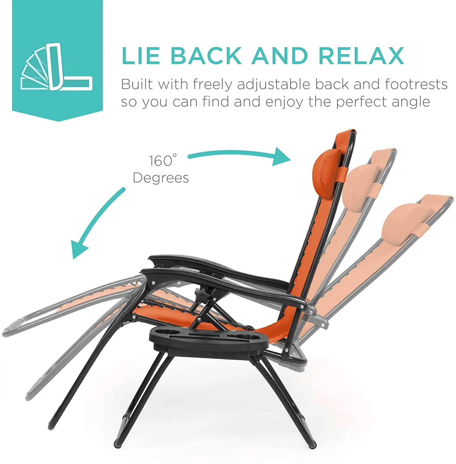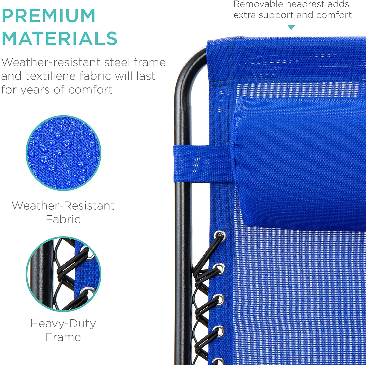 Two-piece zero-gravity lounge chair with two removable cup holders, made of durable steel pipe and excellent breathability PVC-coated polyester Fabric, which can bear a maximum weight of 350lb. It can easily adjust the angle of the recliner through the plum lock as if the weightless sitting experience allows you to release your body pressure and enjoy a rare leisure time. The foldable design allows you to carry it easily and freely to go to the beach, courtyard, or forest lawn, which is very convenient.