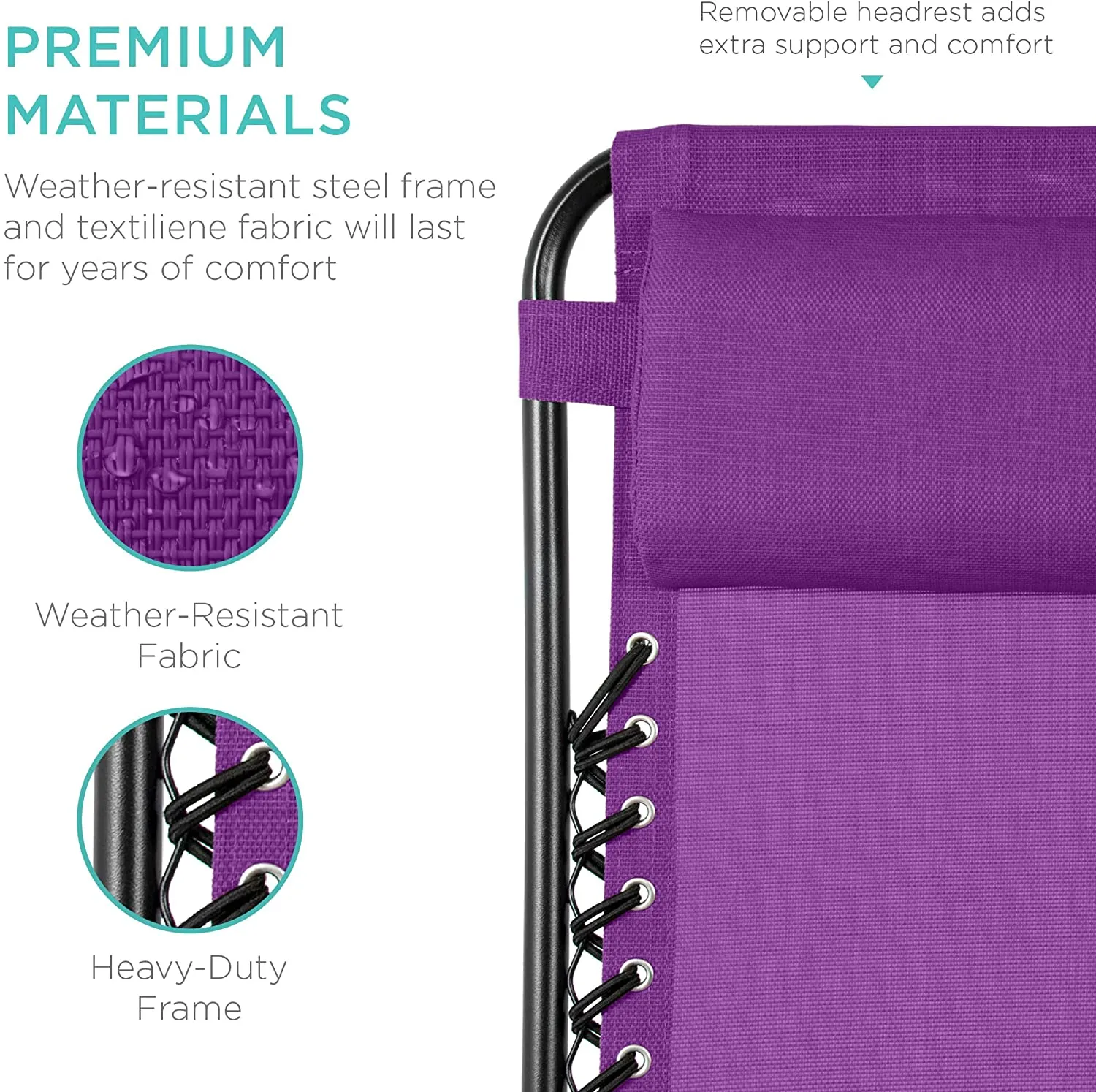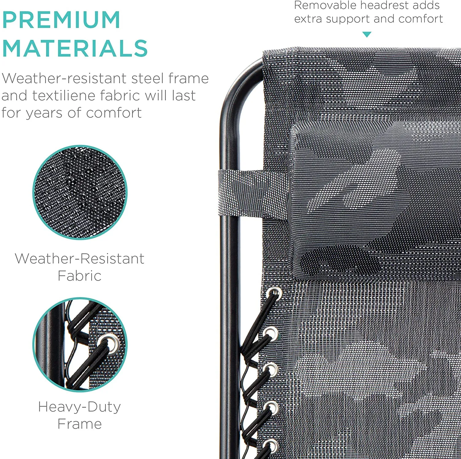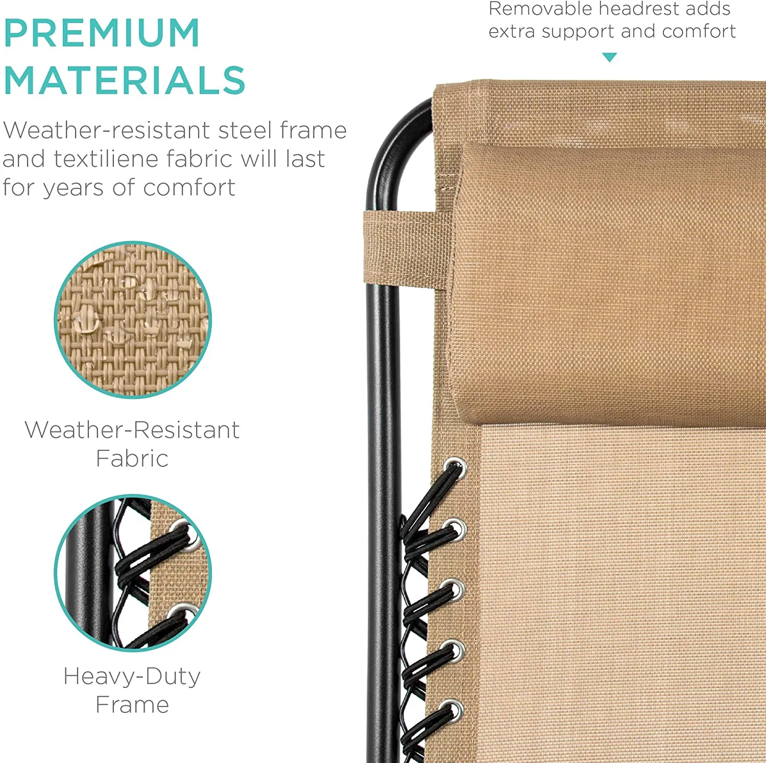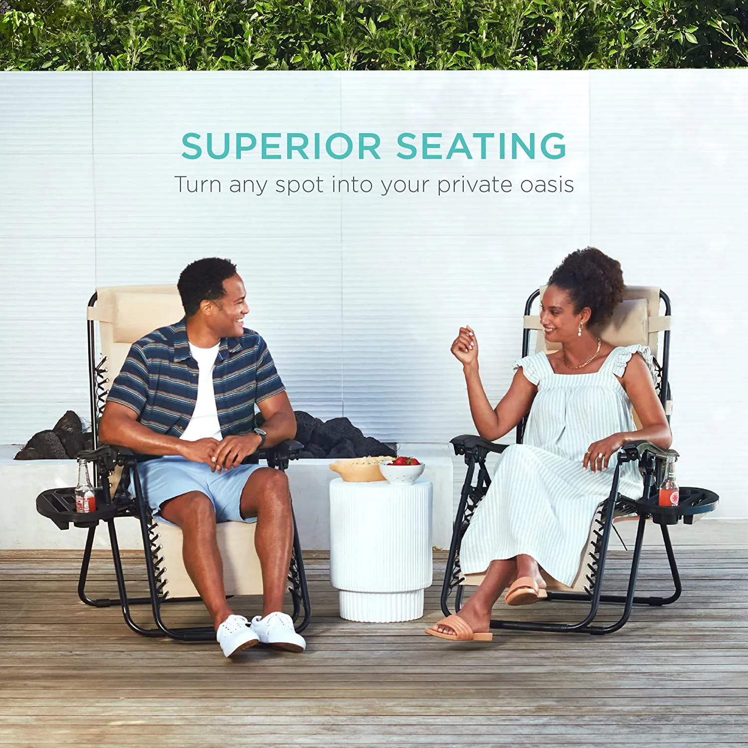Two-piece zero-gravity lounge chair with two removable cup holders, made of durable steel pipe and excellent breathability PVC-coated polyester Fabric, which can bear a maximum weight of 350lb. It can easily adjust the angle of the recliner through the plum lock as if the weightless sitting experience allows you to release your body pressure and enjoy a rare leisure time. The foldable design allows you to carry it easily and freely to go to the beach, courtyard, or forest lawn, which is very convenient.