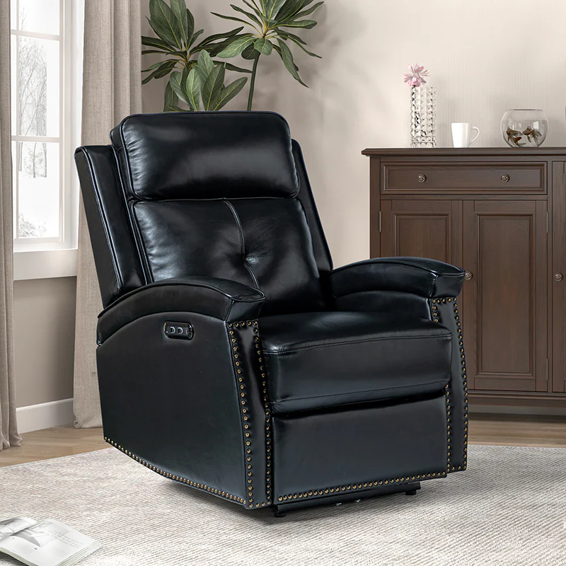 Update your unconscious corners and add a touch of cozy and casual to your home with this contemporary power recliner. This is a facile leather power recliner for the living room and bedroom, perfect for various spaces. Equipped with a high-power USB port, it allows you to complete charging in the shortest possible time. Featuring bronze nailhead trims, the specially shaped arms of this comfortable power recliner have formed an attractive frame at the front. Humanization design with a comfortable headrest fitting the curve of the spine, provides extra comfort for your neck, back, and lumbar. Crafted from sturdy wood, this electric recliner can be extremely useful for adults, especially the elderly. Exquisitely designed with a lean-back silhouette, the leather recliner invites blissful relaxation.