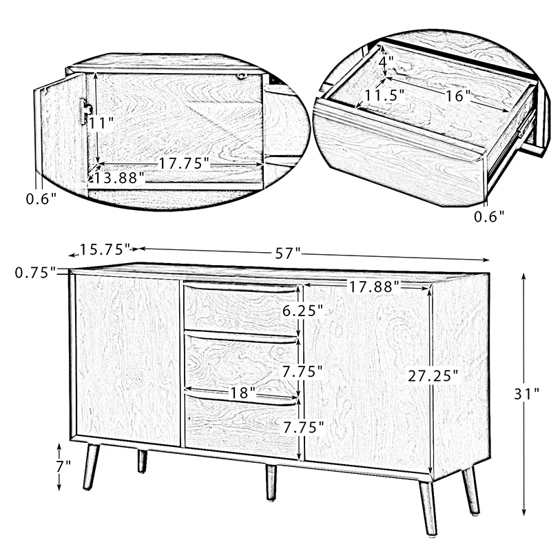 Whether supporting your flat screen or simply accenting your space, a sideboard is always a stylish stage. This mid-century modern sideboard with a streamlined silhouette and unique design brings a touch of understated style to your entertainment ensemble. The design of this sideboard is inspired by the 1950s. It features three pull-out drawers and two cabinets with adjustable shelving, offering ample space to stow away a movie collection, electronics, and any other household odds and ends. This sideboard adds extra storage and a mid-century modern style to your living room.