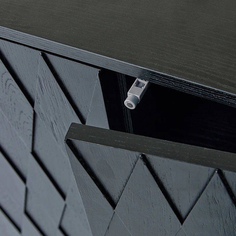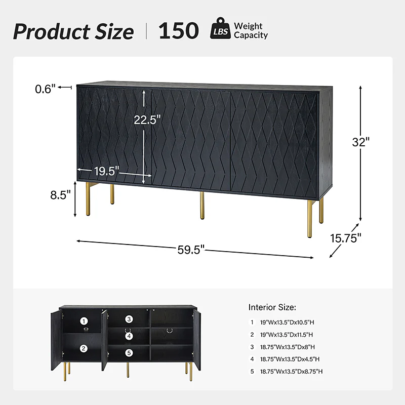 Enjoy daily life with the sleek modern sideboard with geometric diamond-shaped relief door fronts, adding glamour to any space. The doors are veneered in solid wood, and five adjustable shelves inside offer versatile storage options for your belongings, while the push-to-open mechanism ensures easy access. A multimedia hole allows for discreet cable management, maintaining the contemporary sideboard's clean lines. The golden metal legs with adjustable feet offer stability and practicality by accommodating different surfaces. The entire piece is coated in a refined paint finish, enhancing its durability and visual appeal. Suitable for decluttering your living room or hallway, this sideboard is inspired by classic mid-century design and displays a striking diamond pattern.