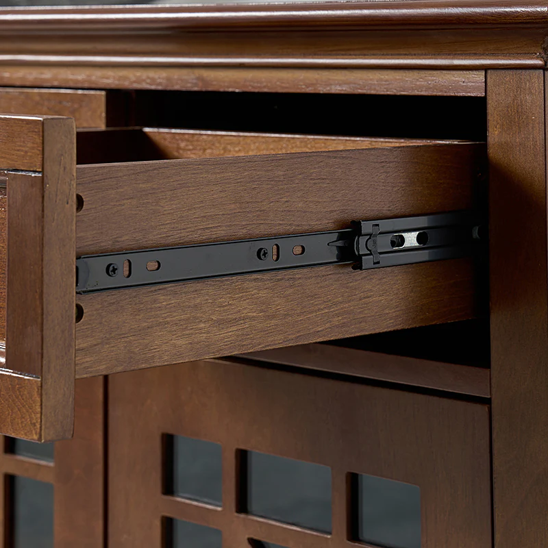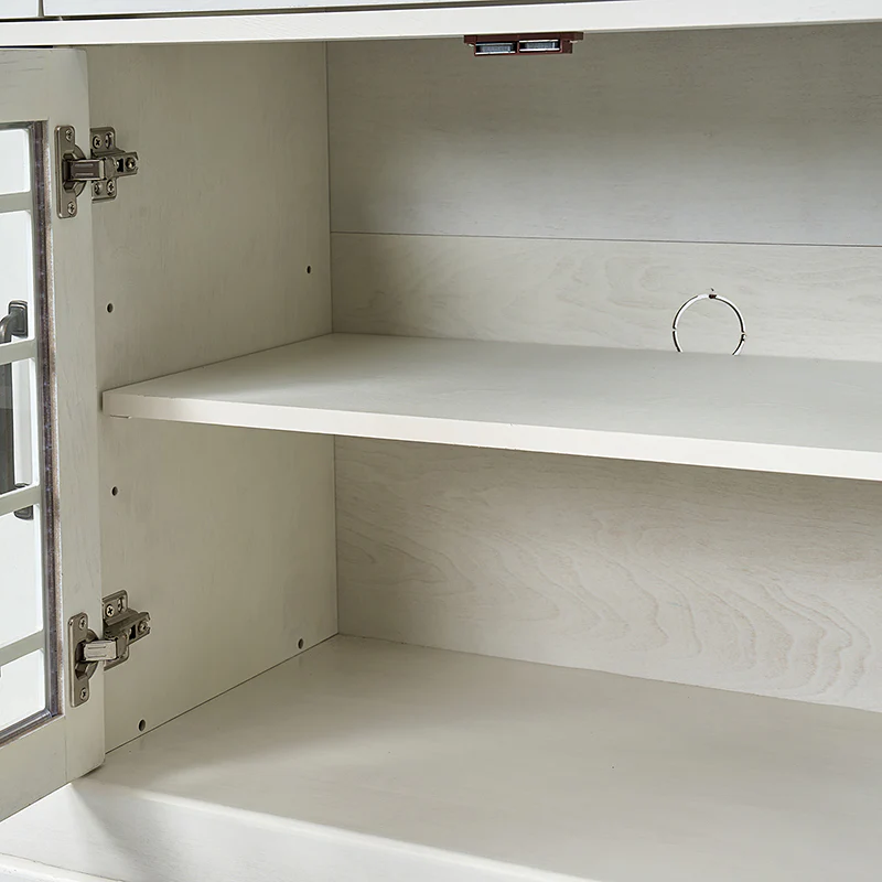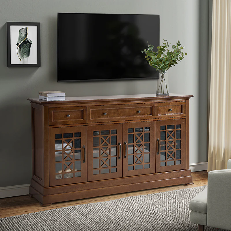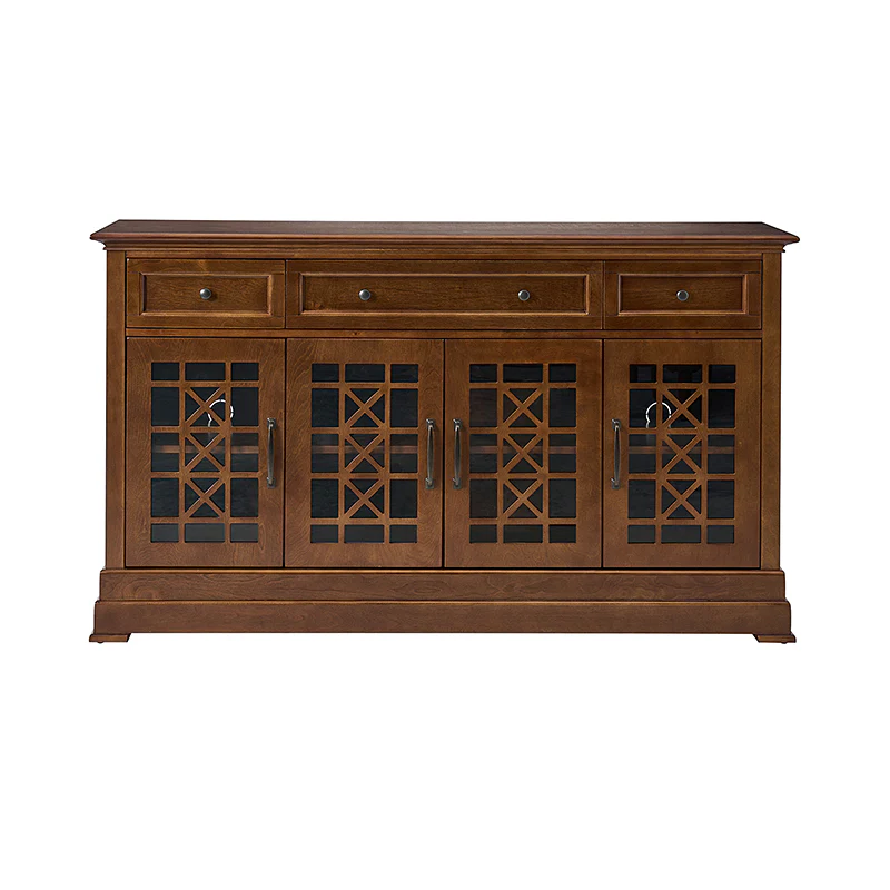 This elegant sideboard is a versatile addition to any dining or living space, designed with both form and function in mind. It features three drawers, with a felt-lined bottom drawer in the center, ensuring daily items are protected from scratches, making it an ideal storage solution for your tableware. The cable management system discreetly organizes wires, maintaining a clutter-free space. Its versatility shines through with an adjustable shelf, catering to varying storage needs. The sideboard's glass fronts are adorned with a chic crisscross pattern, adding a touch of sophistication while showcasing your cherished items. Plus, it rests on adjustable feet, providing stability on different surfaces, making it a practical and stylish choice for your home.