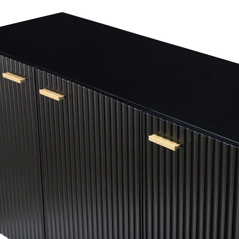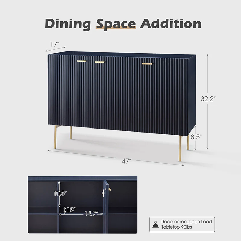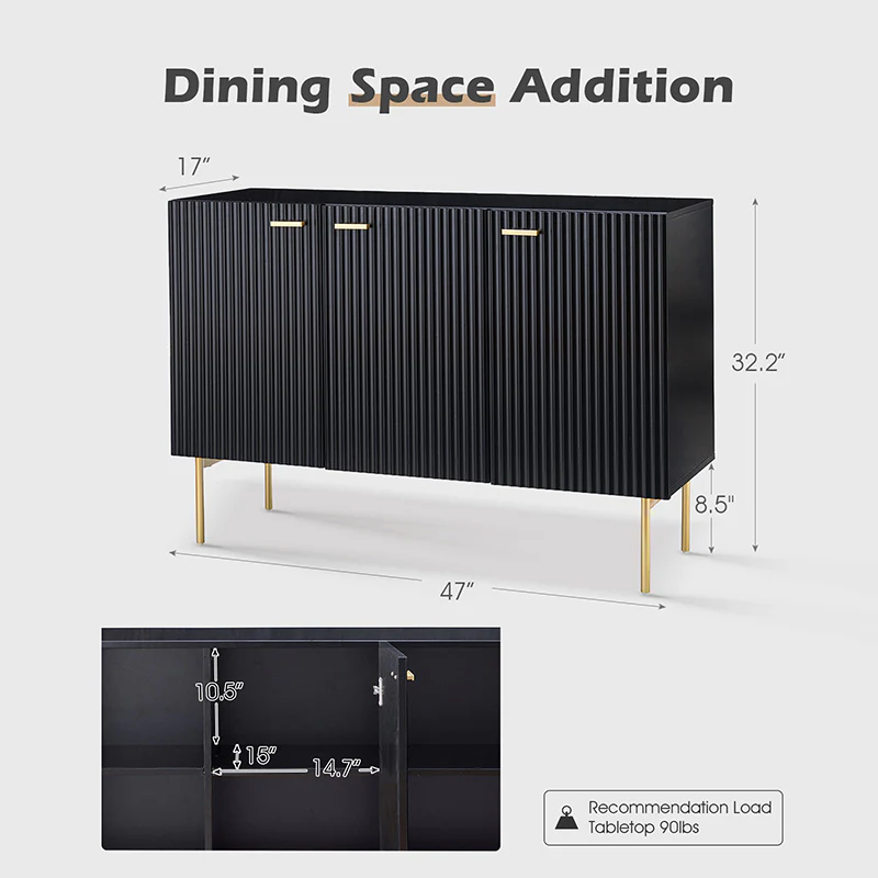 The sideboard adds a different modern chic to your home. The elegant design style matches any color scheme and decoration style. The sideboard has a spacious tabletop, which is convenient for placing decorations or daily necessities, and there are 3 doors and 3 removable shelves inside to put plates, cups, towels, shower gels, brushes, shoes, books, etc. Make your room tidy and orderly with this sideboard. Moreover, the metal legs and bar pulls add more flair to your home. This storage sideboard is made from a high-quality MDF board, which is very sturdy and scratch-resistant and does no harm to your body. It will not damp easily or deform like ordinary wood even after years of use. The sideboard can not only be used as a sideboard, but also can be served as a locker for books, shoes, bathroom stuff, and other items, even as a home decoration. It can be placed in the kitchen, living room, bedroom, hallway, or entryway.